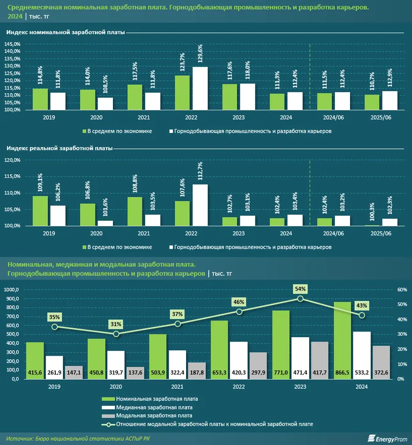 Заработная плата в горнодобывающей промышленности за последние несколько лет увеличивалась немного заметнее, чем в целом по экономике. Согласно данным БНС, в первом полугодии 2025-го номинальная зарплата в среднем по экономике выросла на 10,7%, а в горнодобывающей промышленности — на 12,9%. Сходная тенденция просматривается и в росте покупательной способности зарплат. Рост реальной зарплаты за тот же период составил 0,3%, а именно в горнодобывающей промышленности — 2,3%.