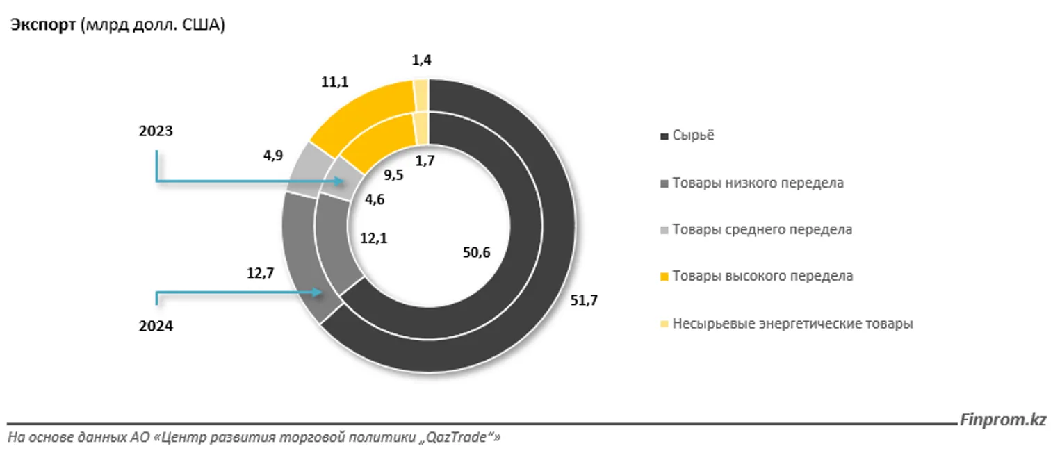 Много лет подряд основу казахстанского экспорта составляют сырьевые товары. Их доля в общем объёме продаж за границу в 2024 году составила 63,3%. Второе место в структуре поставок заняли товары низкого передела: 15,5%. Продукция высокого передела оказалась лишь на третьей строчке по стоимостному объёму.