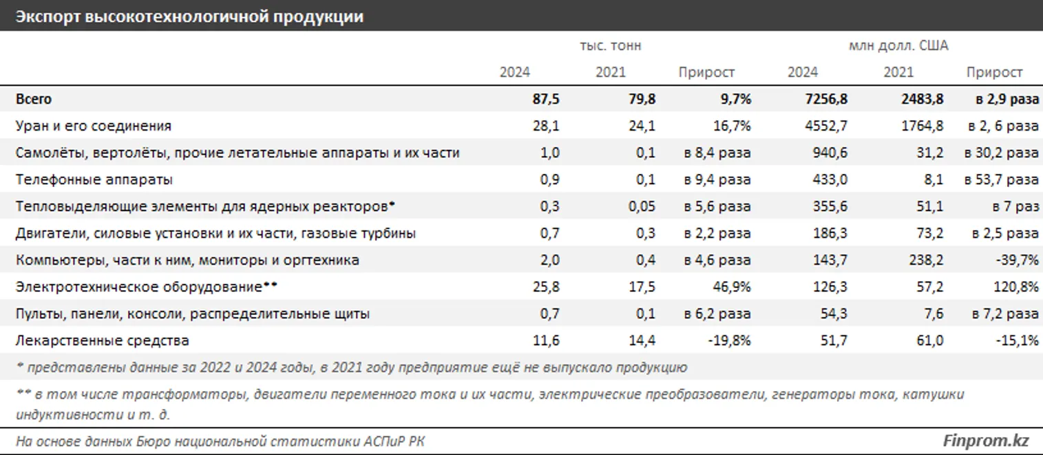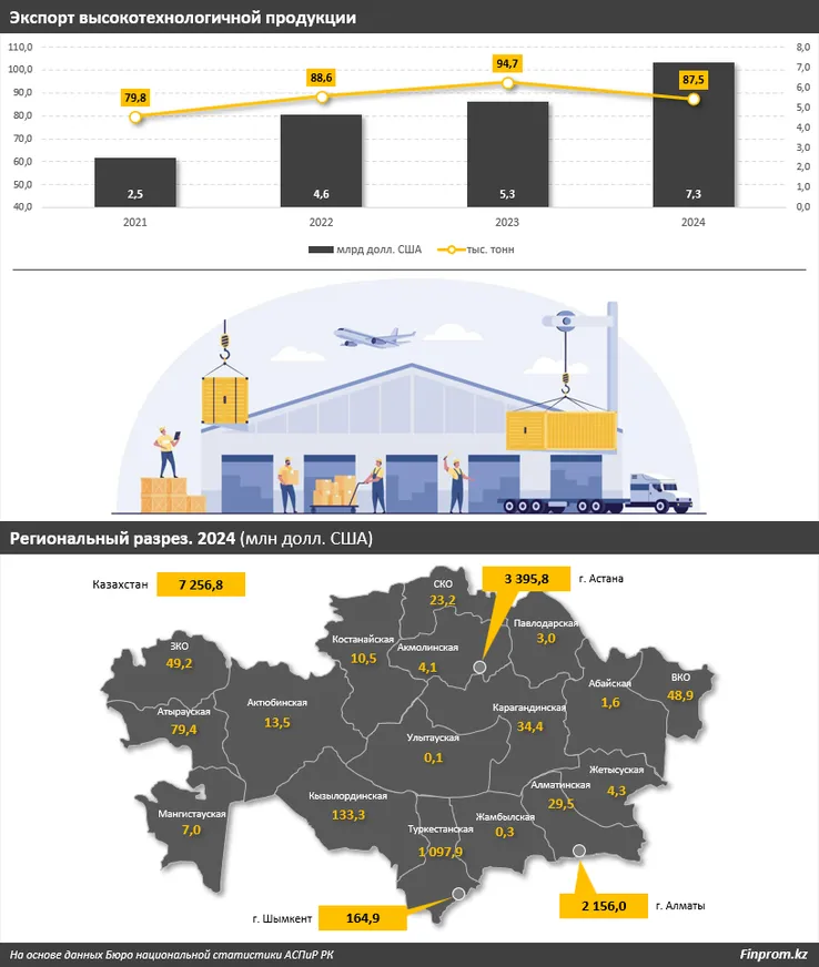 За три года стоимостный объём экспорта высокотехнологичных товаров из Казахстана увеличился почти в три раза. По данным Бюро национальной статистики, в прошлом году поставки такой продукции за рубеж достигли 7,3 млрд долларов. В 2021-м показатель был куда скромнее: всего 2,5 млрд долларов, пишет finprom.kz.