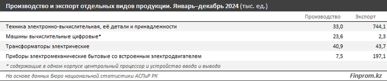 На то, что поставки таких товаров следует называть скорее не экспортом, а реэкспортом, указывает статистика БНС. Вот как выглядит разница между производством и экспортом такой продукции. В прошлом году в Казахстане было произведено 33 тыс. единиц электронно-вычислительной техники, а экспортировано — 744,1 тыс. единиц, то есть в десятки раз больше. Поставки электромеханических приборов из РК за прошлый год составили 197,1 тыс. единиц, при этом произведено было всего 7,5 тыс. единиц такой продукции.