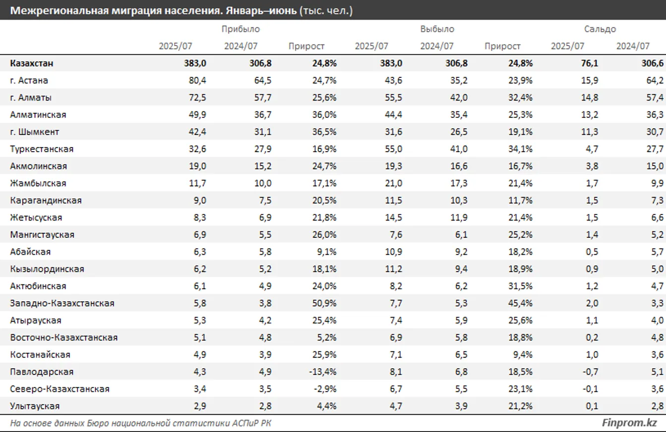 Рассмотрим миграционные процессы внутри Казахстана. За январь–июнь текущего года в пределах страны кардинально сменили место жительства 383 тыс. человек — на 24,8% больше, чем за аналогичный период 2024-го.
