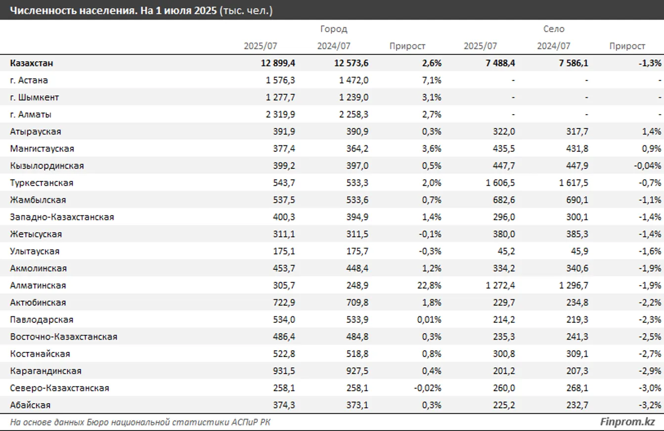 В то же время численность сельского населения сократилась сразу в 15 регионах страны. Прирост численности сельчан был отмечен лишь в Атырауской (на 1,4% за год, до 322 тыс. человек) и Мангистауской (на 0,9%, до 435,5 тыс. человек) областях. Наибольшее сокращение численности сельского населения наблюдалось в Абайской (на 3,2%, до 225,2 тыс. человек), Северо-Казахстанской (на 3%, до 260 тыс. человек) и Карагандинской (на 2,9%, до 201,2 тыс. человек) областях, наименьшее — в Кызылординской области (всего на 0,04%, до 447,7 тыс. человек).