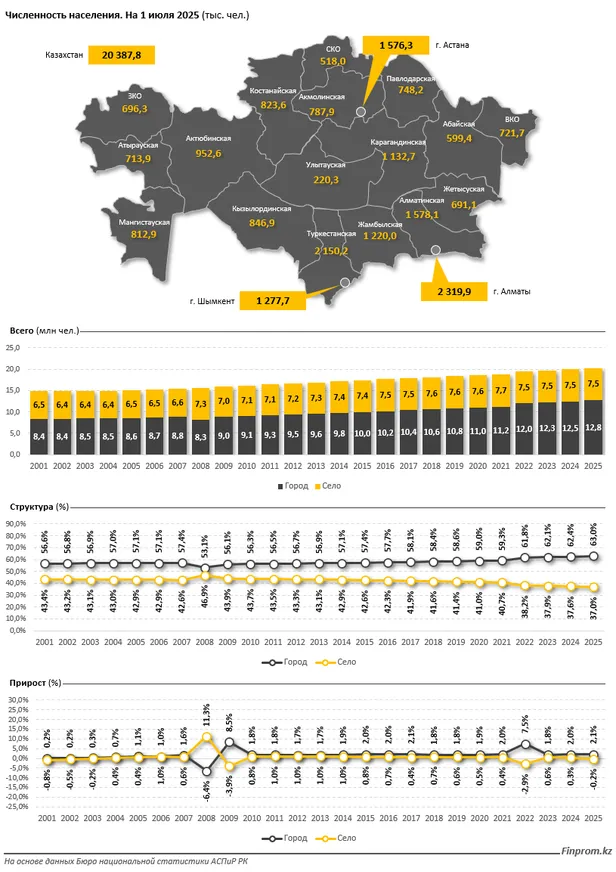 На 1 июля текущего года в РК проживало 20,4 млн человек — на 1,1% больше, чем годом ранее. Прирост населения составил 228,1 тыс. человек. Наиболее густонаселёнными регионами остались Алматы (2,3 млн человек — плюс 2,7%, или плюс 61,6 тыс. человек за год), а также Туркестанская (2,2 млн человек — минус 0,03%, или минус 568 человек) и Алматинская (1,6 млн человек — плюс 2,1%, или плюс 32,5 тыс. человек) области, пишет finprom.kz.