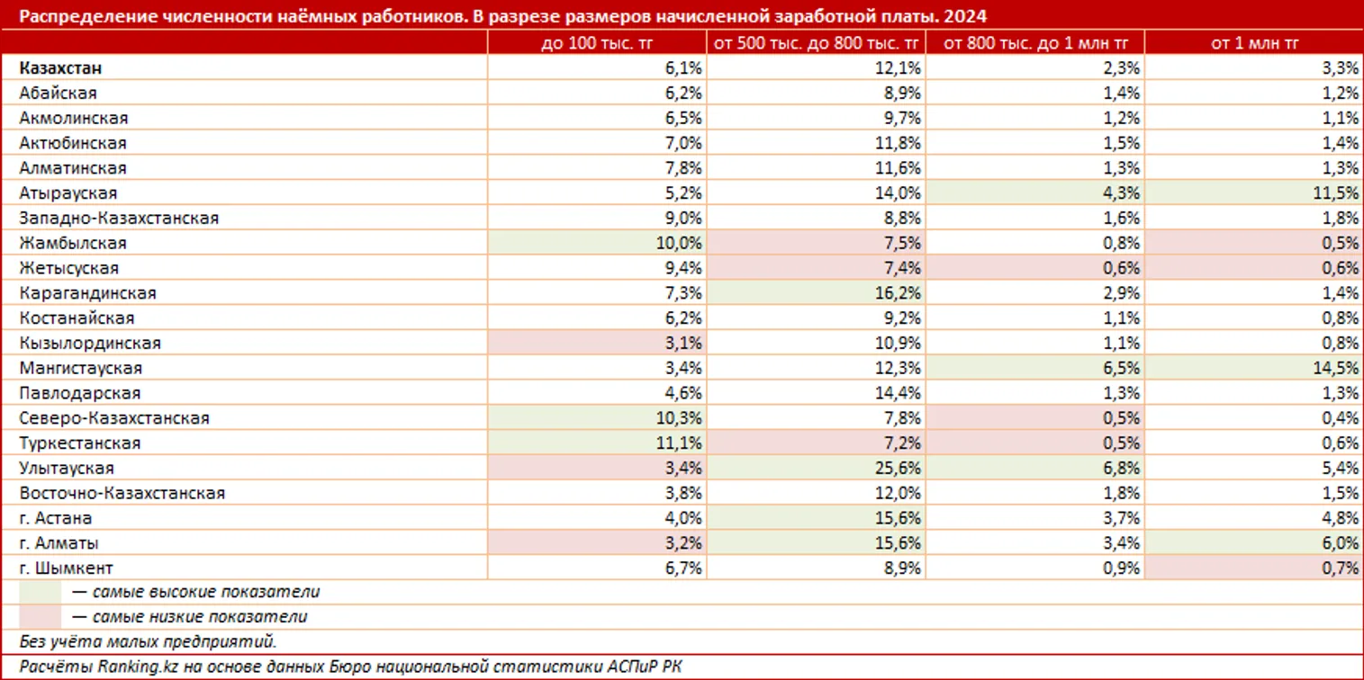 Больше всего работников-миллионеров в 2024 году приходилось на Мангистаускую (14,5%) и Атыраускую (11,5%) области. Меньше, чем в нефтяных регионах, но все же весьма заметным был удельный вес зарабатывающих от 1 млн тенге в Алматы (6%) и Астане (4,8%).