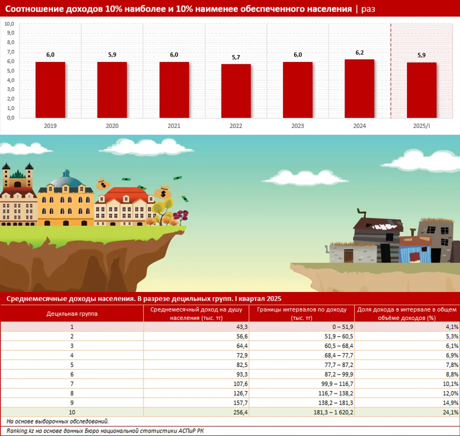 В течение последних нескольких лет в РК не меняется в лучшую сторону ситуация с экономическим неравенством в обществе. Об этом свидетельствует статистический показатель — соотношение доходов 10% наименее обеспеченного и 10% наиболее обеспеченного населения. С 2019 по 2023 год доходы этих двух групп населения отличались в 5,9–6 раз, а в прошлом году — в рекордные 6,2 раза, пишет Ranking.kz.