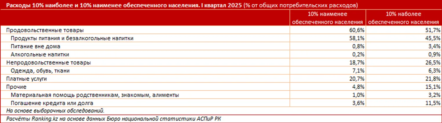 Доля расходов на платные услуги в обеих группах почти одинакова: 20,7% у бедных против 21,8% у наиболее обеспеченных. В противовес этому у 10% наиболее обеспеченных казахстанцев значительно больше кредитная нагрузка. Дело не только в том, что они чаще и больше берут кредиты или просят в долг, но и в том, что у них куда заметнее доля кредитных выплат в потребительских расходах: 11,5% против 3,6% у малообеспеченных.