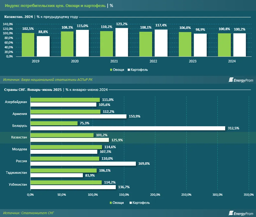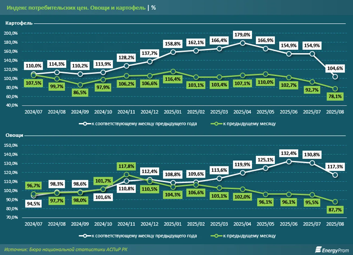 В таблице приведены индексы потребительских цен в трех временных промежутках: за прошедший месяц, за период в сравнении с концом 2024-го и за год. Если рассмотреть данные в коротком временном интервале, в конце лета действительно можно заметить снижение цен. Например, в августе текущего года индекс потребительских цен на картофель в сравнении с июлем составил 78,1%, то есть было зафиксировано удешевление на 21,9% за месяц. Однако если сопоставить цены на этот популярный продукт нового урожая с зимними ценами, когда поставщики платили не только за доставку товара с поля до рынка, но и за его хранение на складах, разница будет уже не в пользу свежесобранного. В августе в сравнении с декабрем стоимость картофеля увеличилась на 9,1%. Рост за год в целом составил 4,6%. И это с учетом мер по запрету экспорта картофеля, принятых еще в начале года. Но об этом чуть позже. Все приведенные данные взяты из отчетов Бюро национальной статистики (БНС) АСПиР РК.