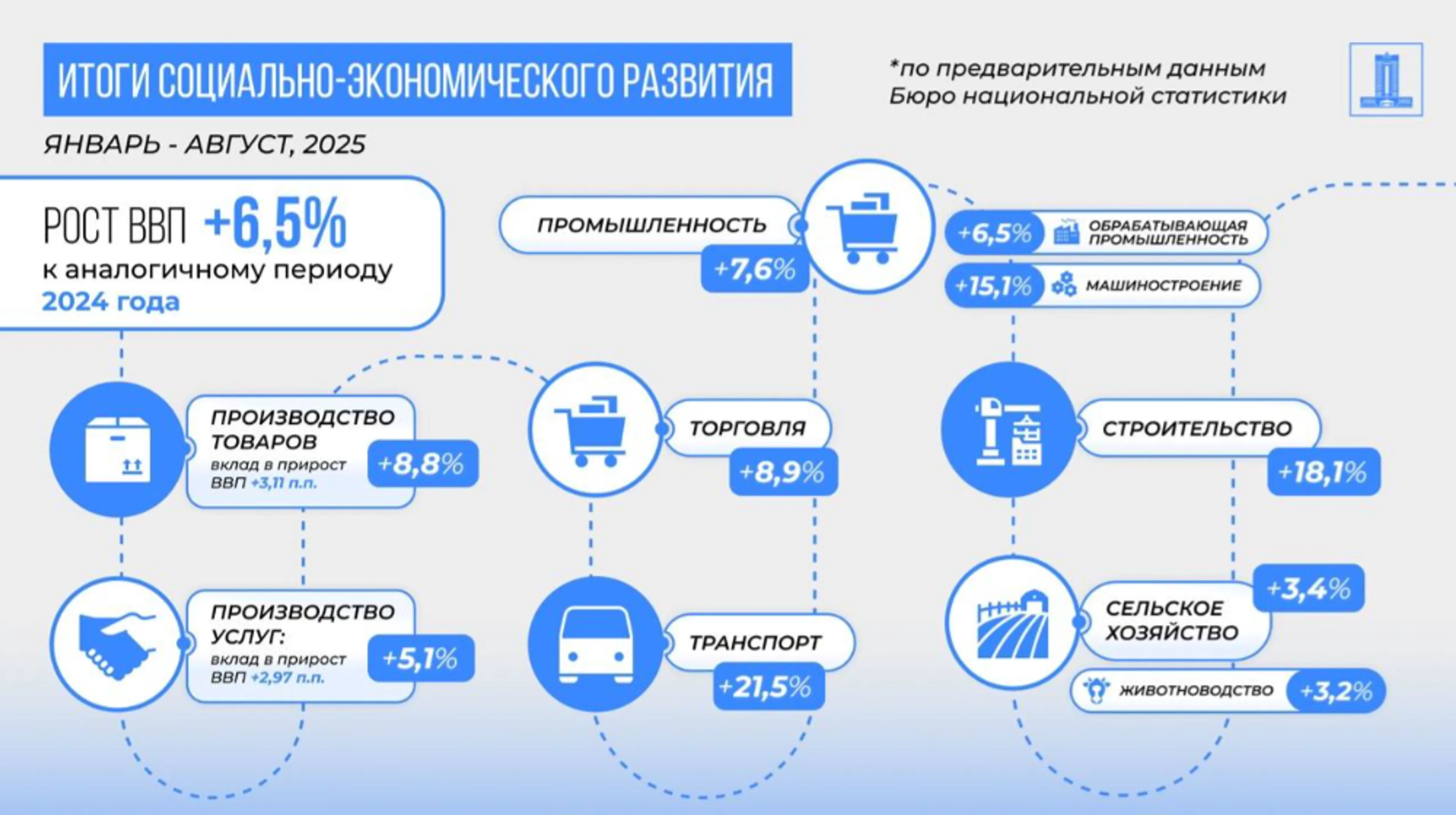 За восемь месяцев 2025 года рост ВВП Казахстана составил 6,5%, передает центр деловой информации Kapital.kz со ссылкой на пресс-службу министерства национальной экономики.