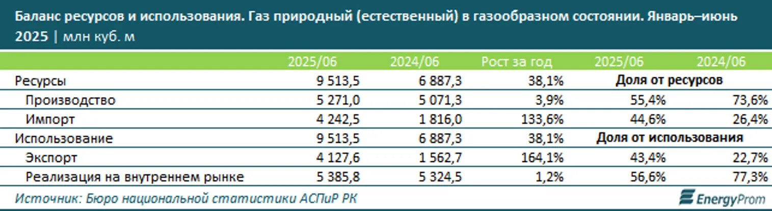 На долю импорта, соответственно, пришлось 44,6% от ресурсов, в то время как доля экспорта составила 43,4%, против 22,7% годом ранее. В целом экспорт и реэкспорт выросли в 2,6 раза, до 4,1 млрд куб. м. В деталях экспорт выглядел так: за полгода Казахстан отправлял природный газ только в две страны — Россию (2,7 млрд куб. м на сумму 59,4 млн долларов) и Китай (1,4 млрд куб. м на сумму 350,4 млн долларов).