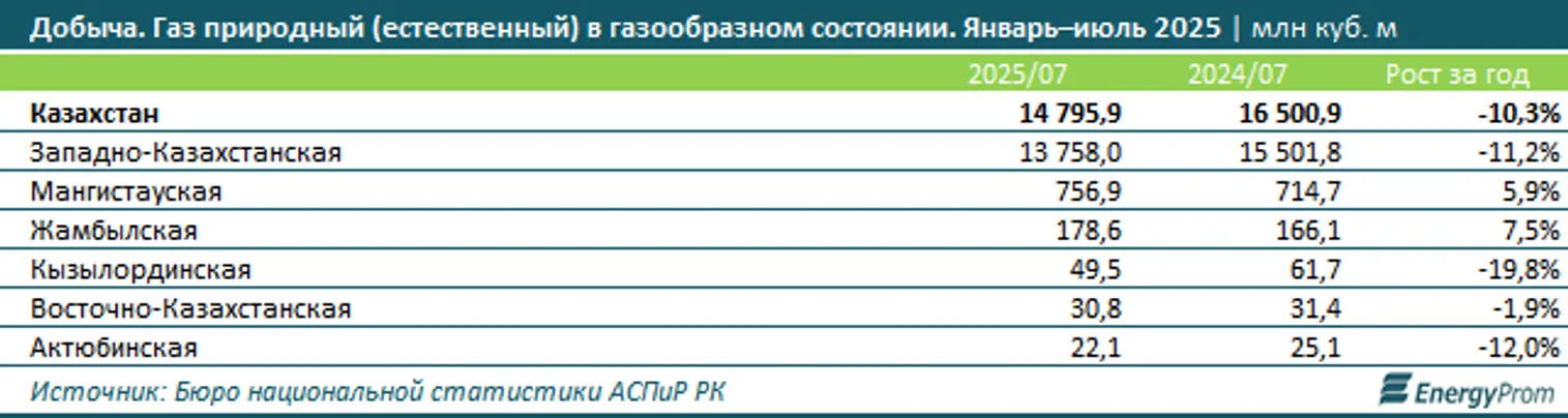За январь–июль текущего года объём добычи природного газа в Казахстане составил 14,8 млрд куб. м — на 10,3% меньше, чем за аналогичный период 2024-го. Основная часть добычи традиционно пришлась на Западно-Казахстанскую область: 13,8 млрд куб. м, или 93% всего объёма по РК. Годовое сокращение здесь составило 11,2%. Газ также добывали в Мангистауской (756,9 млн куб. м), Жамбылской (178,6 млн куб. м), Кызылординской (49,5 млн куб. м), Восточно-Казахстанской (30,8 млн куб. м) и Актюбинской (22,1 млн куб. м) областях, пишет energyprom.kz.