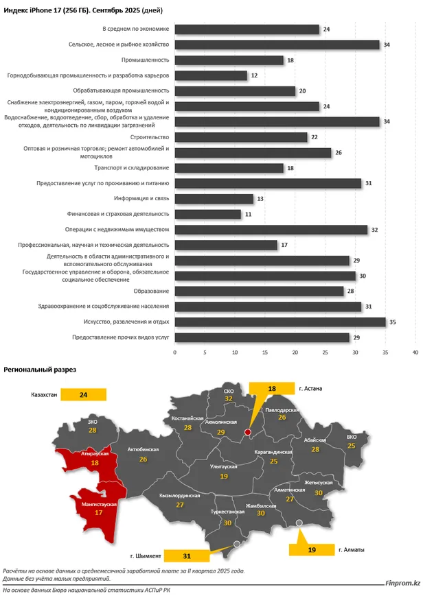 Вернёмся к тому, как выглядит индекс iPhone 17, если рассчитывать его не по медианной, а по номинальной зарплате — индикатору, который чаще всего используется в казахстанской статистике. Повторим: по данным Бюро национальной статистики АСПиР РК, средняя номинальная зарплата во втором квартале текущего года составляла 448,6 тыс. тенге. Таким образом, для покупки новинки от Apple необходимо отработать 24 дня. С учётом выходных это, как мы уже обозначили выше, чуть больше месяца. Зачем мы это повторяем? Потому что тут интересен ещё один разрез — отраслевой.