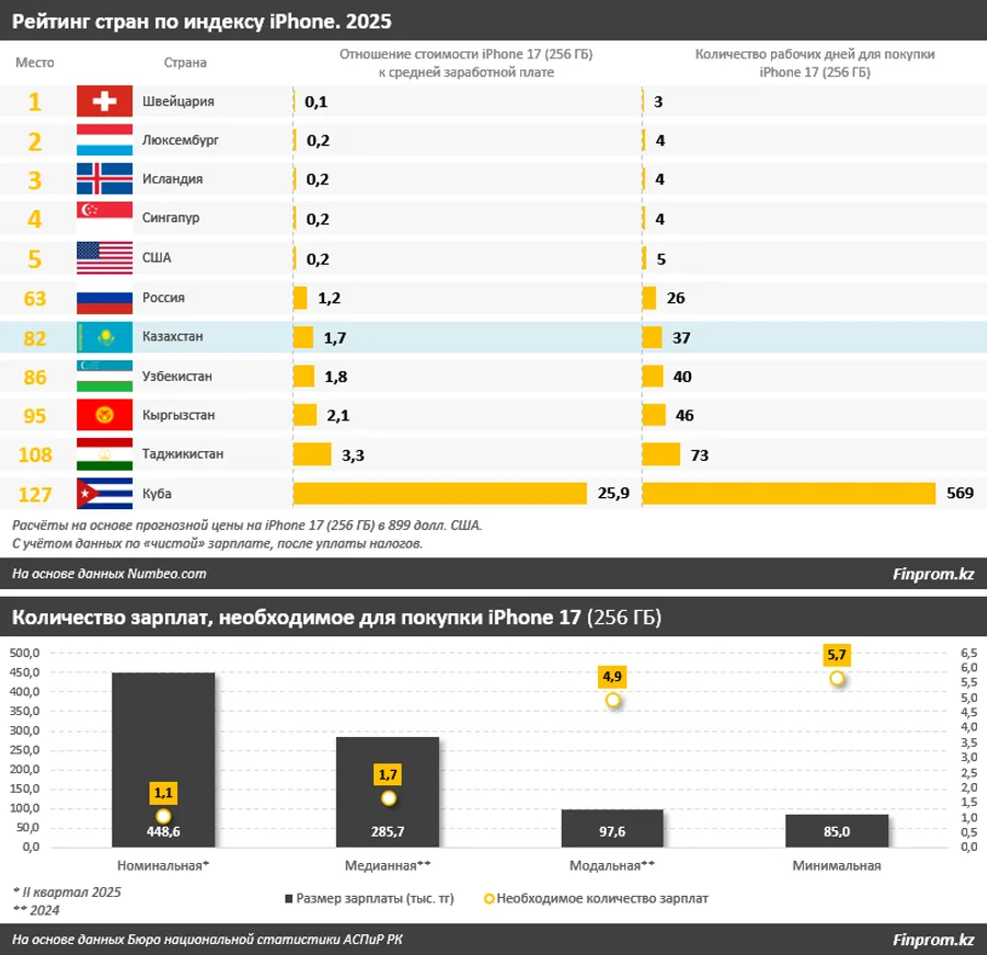 В странах СНГ и Центральной Азии на iPhone 17 уже не хватит даже месячной зарплаты. Казахстан в рейтинге оказался на 82-м месте: на покупку новинки потребуются 37 рабочих дней и сумма, соответствующая 1,7 заработной платы. Уточним: на сайте Numbeo.com средняя казахстанская заработная плата указана в размере 533,4 доллара или 286,4 тыс. тенге. Этот показатель близок к медианной (срединной) заработной плате. Если же казахстанец зарабатывает сумму, равную номинальному показателю доходов (448,6 тыс. тенге), то на покупку iPhone 17 ему потребуется чуть больше одной месячной выплаты от работодателя. Однако мы напомним, что этот показатель — статистический, он отражает среднюю зарплату только на бумаге, а не зарплату среднего казахстанца. Здесь как раз ближе понятие медианной зарплаты.