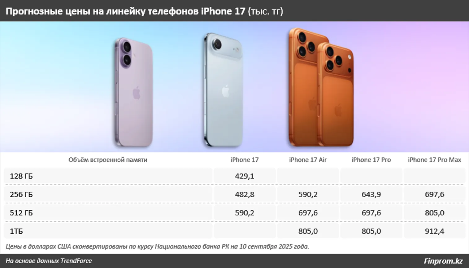 Стартовая цена самого экономичного варианта, с минимальным объёмом памяти в 128 ГБ — 799 долларов. По курсу Национального банка РК на 10 сентября это 429,1 тыс. тенге. Все остальные модели имеют встроенную память от 256 ГБ до 1 ТБ. Согласно прогнозам аналитиков TrendForce, iPhone 17 в комплектации Air будет продаваться по цене от 1,1 тыс. до 1,5 тыс. долларов в зависимости от объёма памяти. В пересчёте на казахстанскую валюту это 590–805 тыс. тенге. Самый дорогой вариант, iPhone 17 Pro Max с памятью в 1 ТБ, по прогнозам, будет запущен в реализацию по стартовой цене в 1,7 тыс. долларов, или 912,4 тыс. тенге. Уточним: это цены без учёта торговых надбавок ретейла.