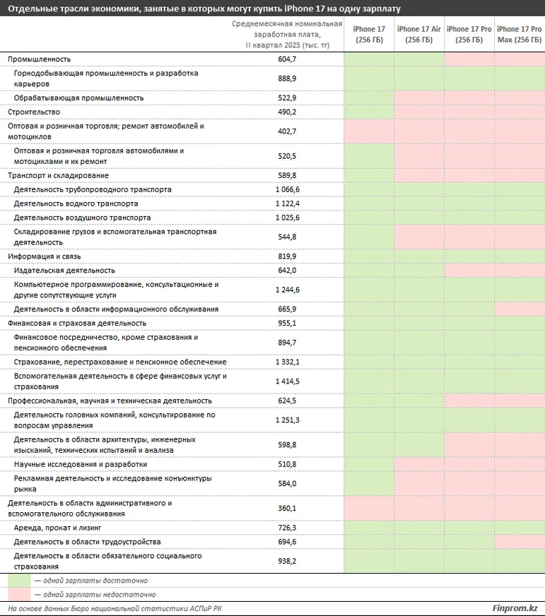 Ещё один момент: указанные цифры мы представили для одной из самых бюджетных версий iPhone 17 с объёмом встроенной памяти в 256 ГБ. И уже по ним видно, что при стоимости в 482,8 тыс. тенге купить его за одну зарплату смогут позволить себе работники не всех отраслей экономики. А вот в таблице ниже мы представили некоторые подкатегории таких отраслей, где зарплата выше указанной суммы. Просто для ознакомления.