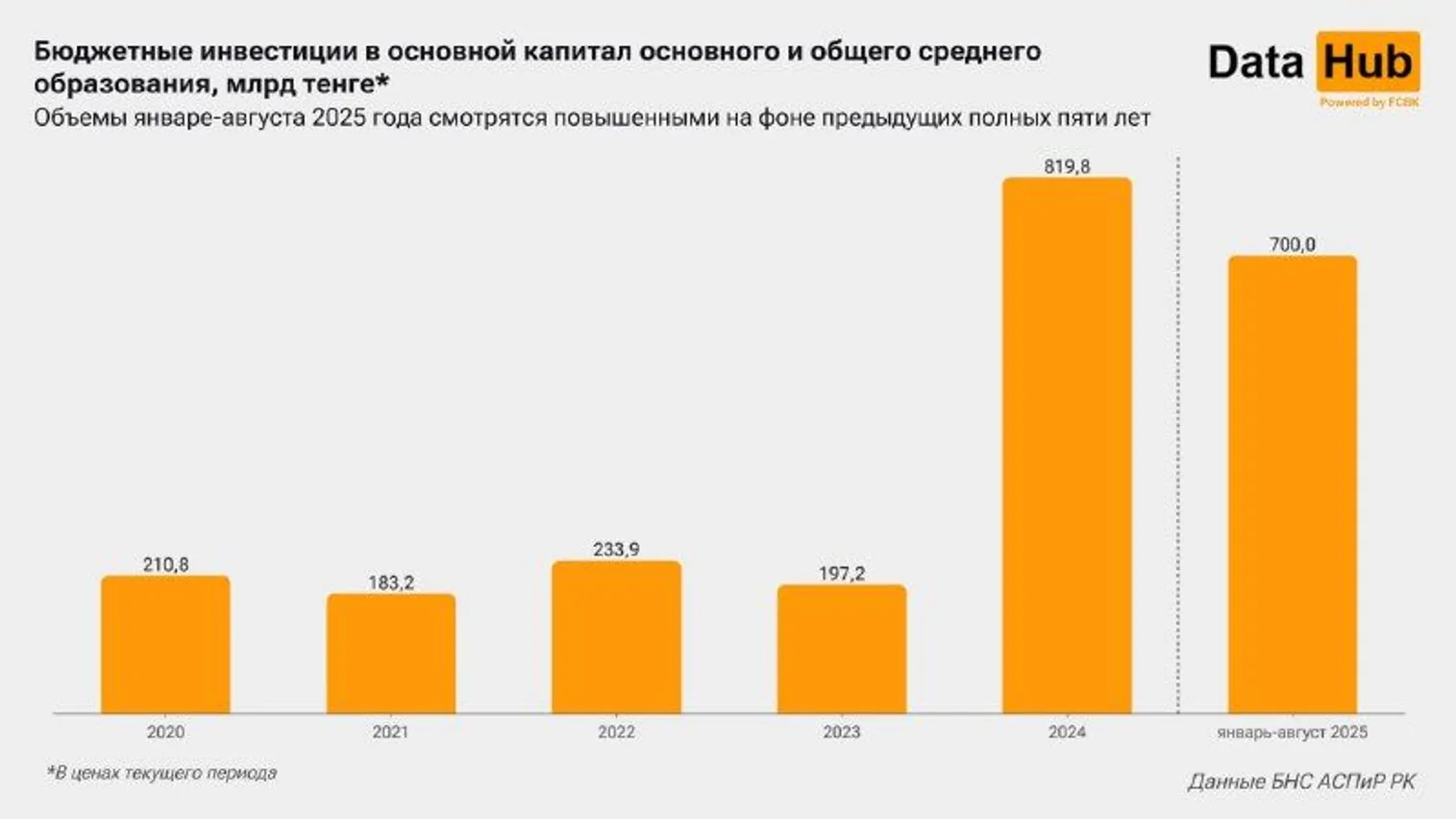 За январь-август бюджетные вложения в основной капитал основного и общего среднего образования достигли 700 млрд тенге — в номинальном выражении это почти в 2,5 раза больше, чем годом ранее. Так много по итогам восьми месяцев не было по меньшей мере за предыдущие пять лет, пишет DATA HUB со ссылкой на данные Бюро национальной статистики.