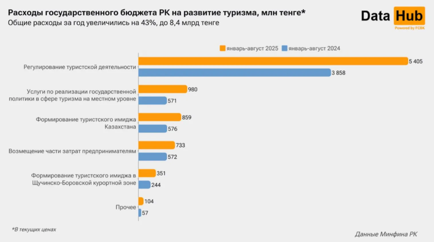 «Существенно выросли и расходы на формирование туристского имиджа Казахстана. Сейчас они составляют 0,9 млрд тенге, +49% к январю-августу 2024 года. Подробной детализации расходов по этому направлению опять же нет. Но материалы СМИ позволяют судить о том, что это может быть, например, проведение в стране международных мероприятий (форумы, выставки, конференции), организация роад-шоу за рубежом, маркетинговые кампании», - полагают аналитики.