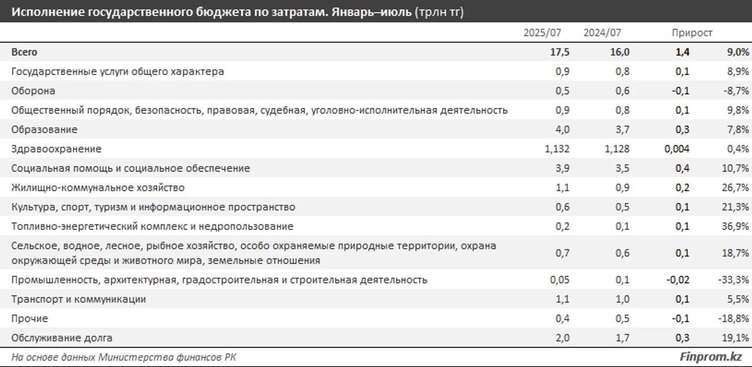 Отдельно можно выделить резкое увеличение расходов госбюджета на обслуживание долга: в январе–июле 2025 года они выросли в годовом выражении на 19,1%, до 2 трлн тенге.