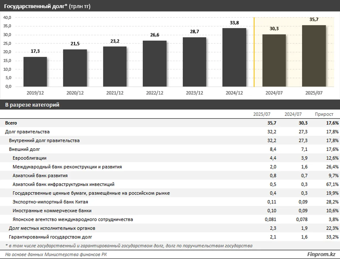 Рассмотрим подробнее сам государственный долг. За январь–июль этот показатель (включая гарантированный долг) достиг рекордной суммы в 35,7 трлн тенге, или 68,5 млрд долларов. В сравнении с аналогичным периодом 2024 года наблюдался рост сразу на 17,6%, или более чем на 5 трлн тенге.