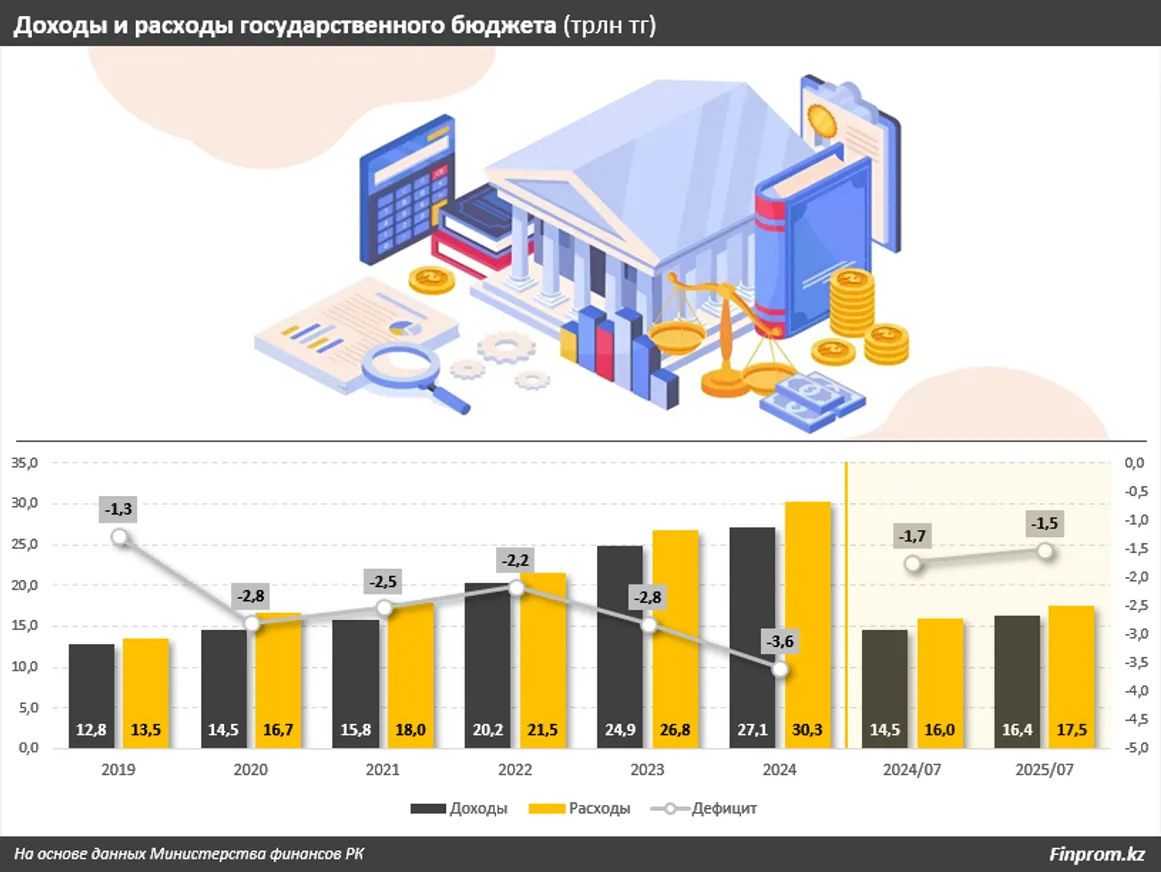 Расходы государственного бюджета Казахстана вновь превысили доходы. Заработав 16,4 трлн тенге, госфинансисты за январь–июль текущего года потратили 17,5 трлн тенге. Согласно данным Министерства финансов РК, дефицит составил более 1,5 трлн тенге. Отметим: это чуть меньше, чем было зафиксировано за аналогичный период 2024 года, когда по итогам июля дефицит превышал 1,7 трлн тенге, подсчитали аналитики Finprom.kz.