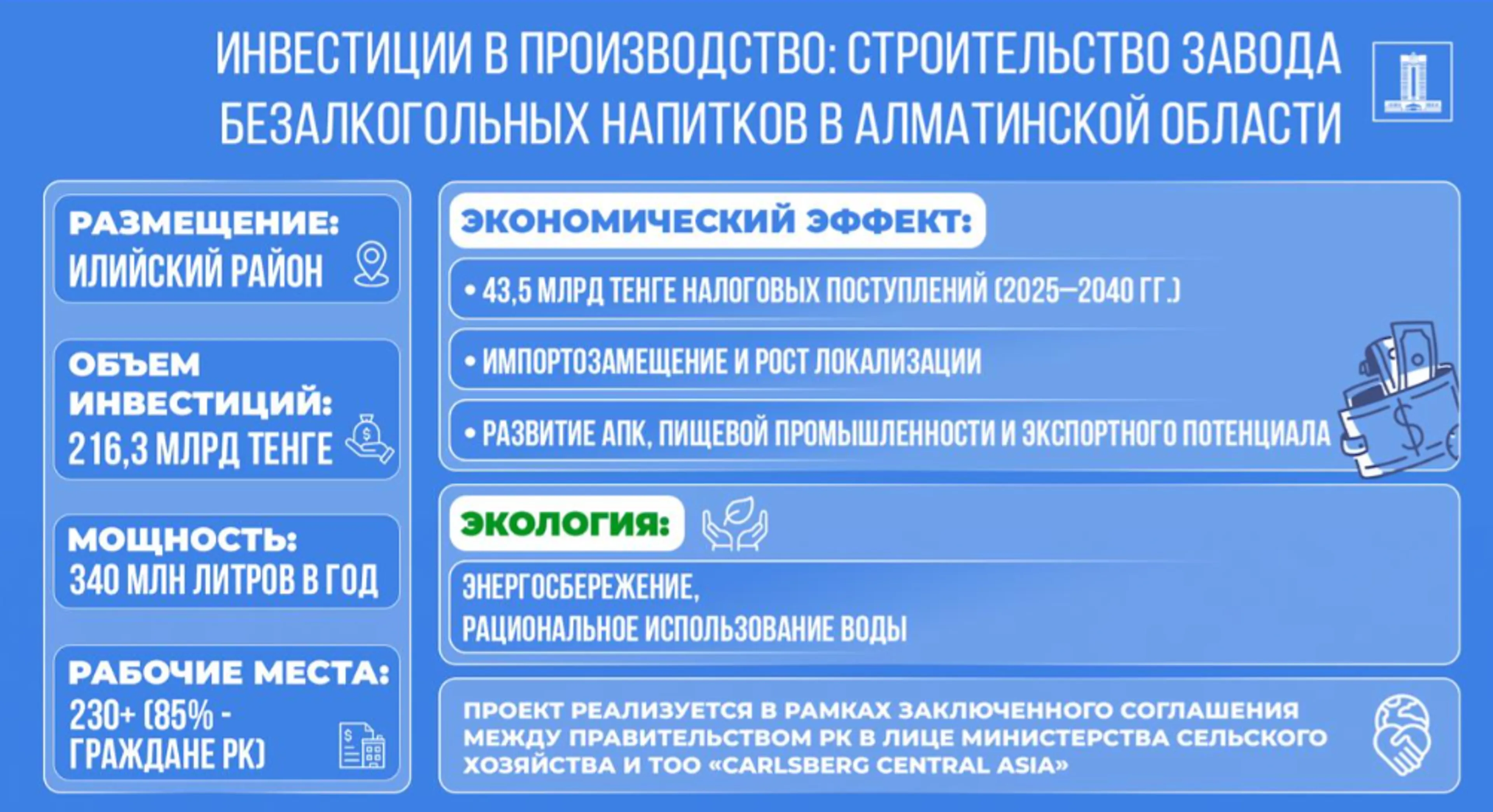 Общий объем инвестиций — более 216 млрд тенге, мощность предприятия – 340 млн литров безалкогольных напитков в год. Запуск нового завода будет способствовать развитию агропромышленного комплекса и пищевой промышленности Казахстана, а также развитию экспортного потенциала.