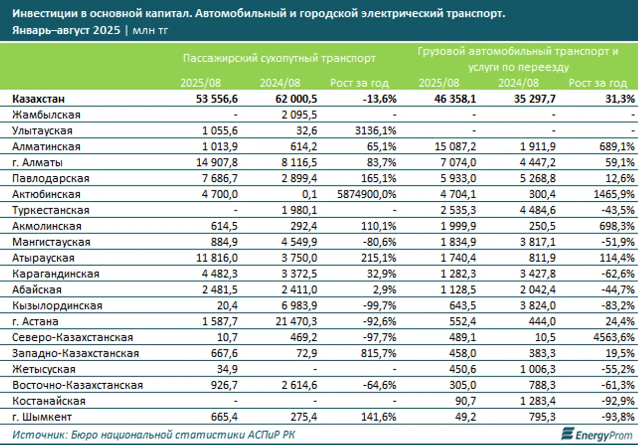 Инвестиции в основной капитал в сфере автомобильного и городского электрического транспорта по итогам января–августа 2025 года составили 53,6 млрд тенге — на 13,6% меньше в стоимостном выражении, чем годом ранее. В том числе инвестиции в сферу автобусных перевозок составили 41,8 млрд тенге, в сектор перевозок метрополитеном — 10,2 млрд тенге, трамваями — 257,4 млн тенге, такси — 84 млн тенге.