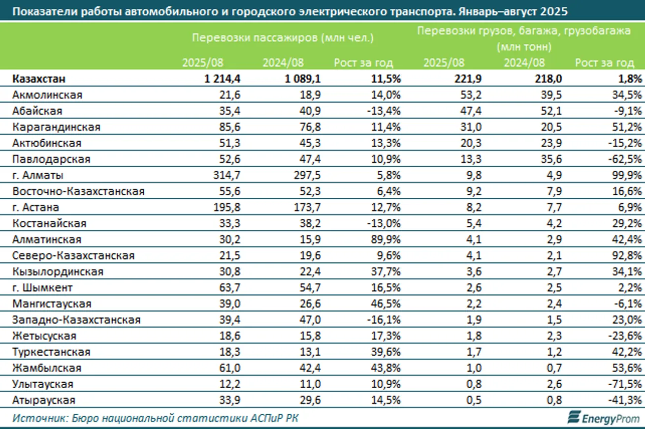 За январь–август текущего года в РК автомобильным и городским электрическим транспортом было перевезено 1,2 млрд пассажиров — на 11,5% больше, чем за аналогичный период 2024-го, пишет energyprom.kz.