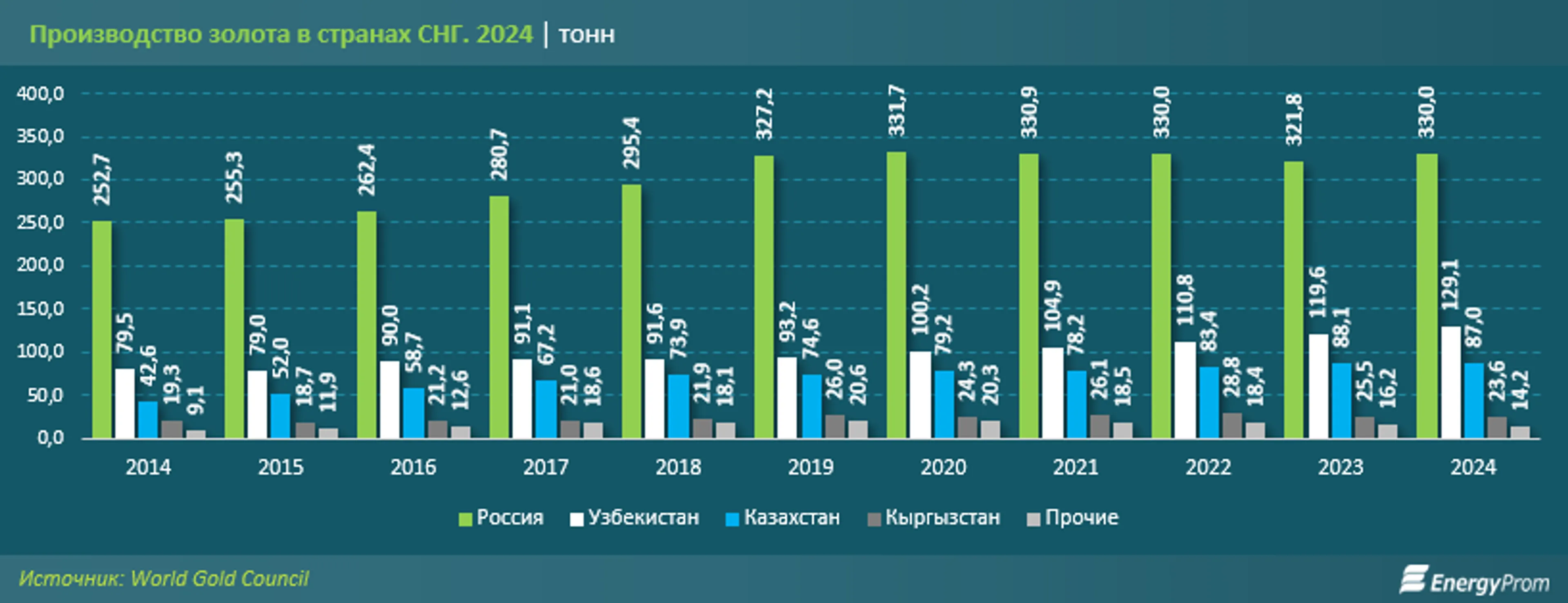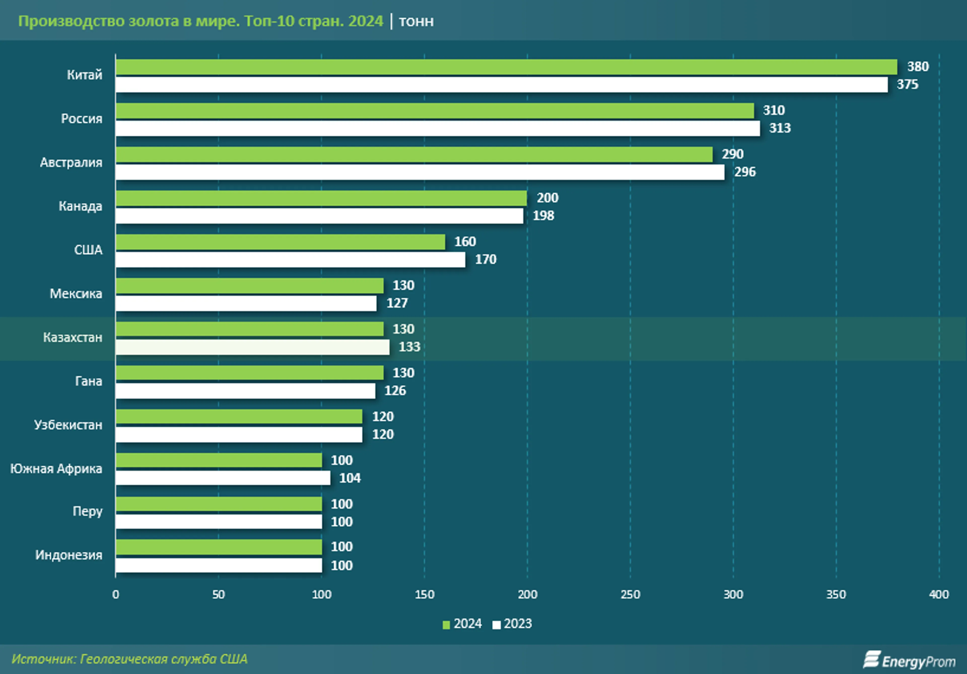 Тут важно пояснить: Геологическая служба США формирует данные на основе официальных отчетов правительств. Так вот, согласно информации БНС, объем добычи необработанного и полуобработанного золота, а также золота в виде порошка, в Казахстане в 2024 году составил именно 130,3 тонны (стоит учитывать то, что Геологическая служба США округляет данные). Отличие от информации World Gold Council объясняется, как мы уже поясняли, тем, какое именно золото берется в расчет.