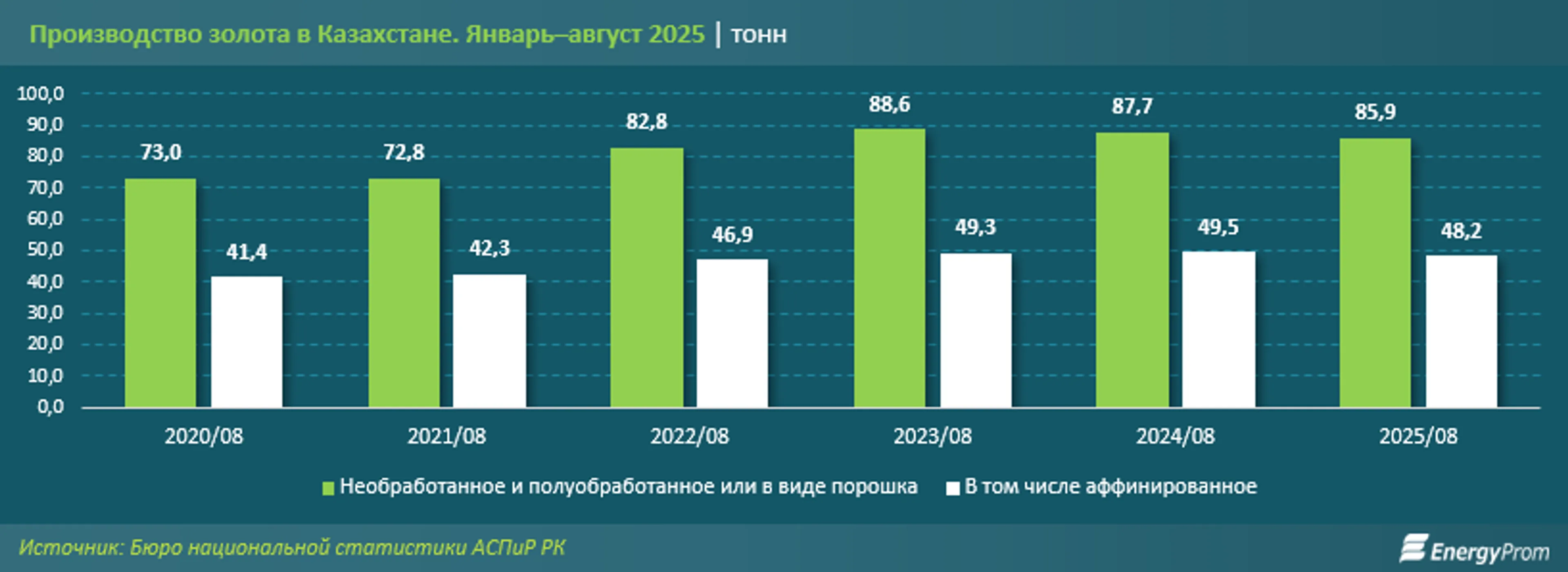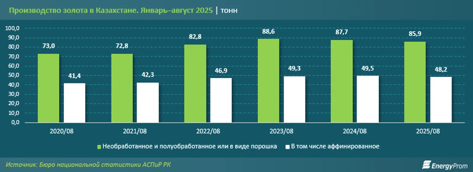 Поговорим о текущем годе. Согласно оперативным данным БНС, за январь–август 2025-го в стране произвели 85,9 тонны необработанного и полуобработанного золота, а также золота в виде порошка — на 2,1% меньше, чем за аналогичный период прошлого года. Из них на аффинированное золото пришлось 48,2 тонны — на 2,5% меньше, чем годом ранее.