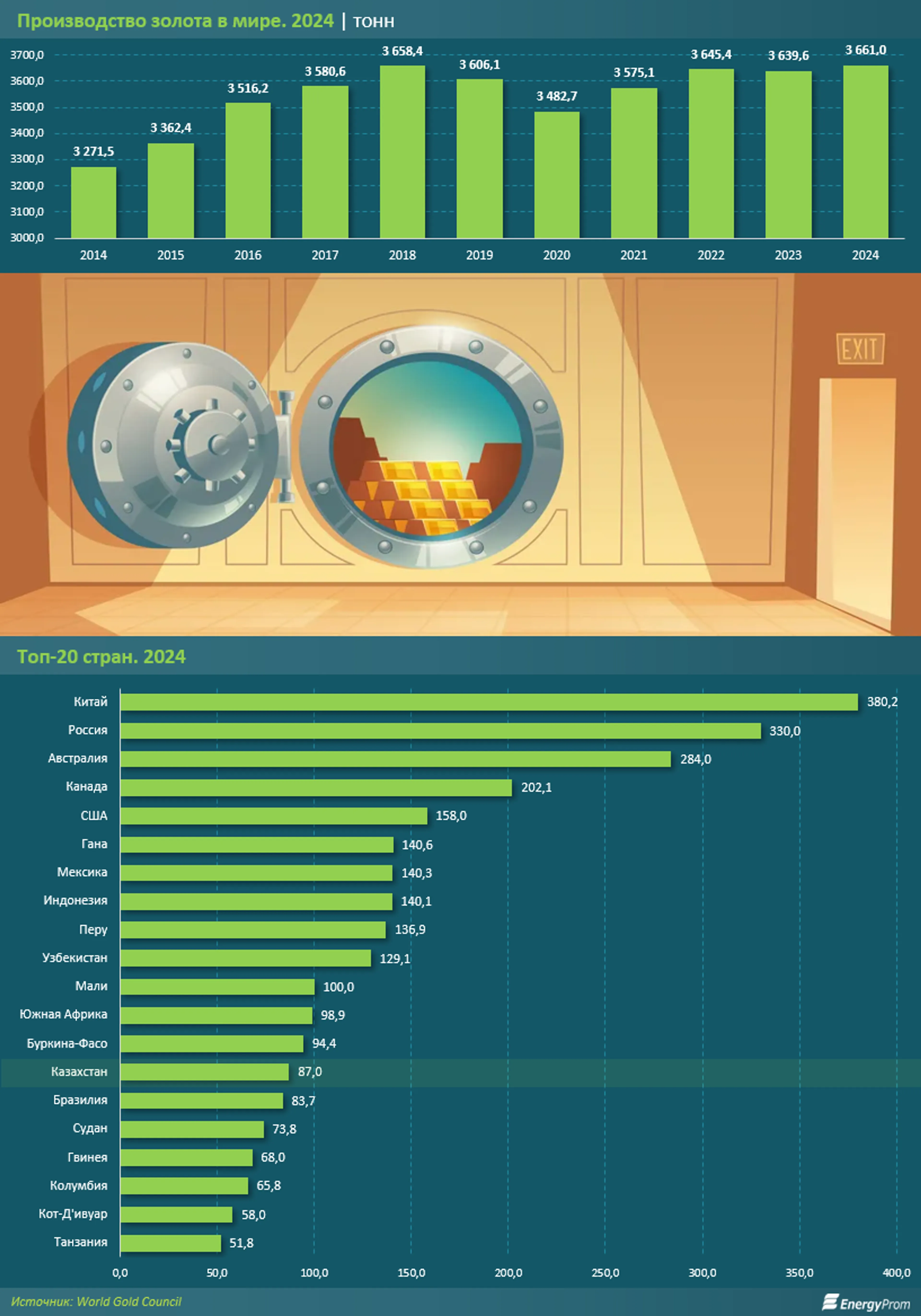 Казахстан, по информации World Gold Council, расположился на 14-м месте с объемом производства в 87 тонн. World Gold Council публикует данные на основе методологии Metals Focus, где учитывается так называемое refined или paid gold — золото, за которое фактически платит аффинажный завод. То есть речь идет не о массе золотоносной руды или полуфабрикатов, а о металле после переработки, максимально близком к аффинированному золоту.