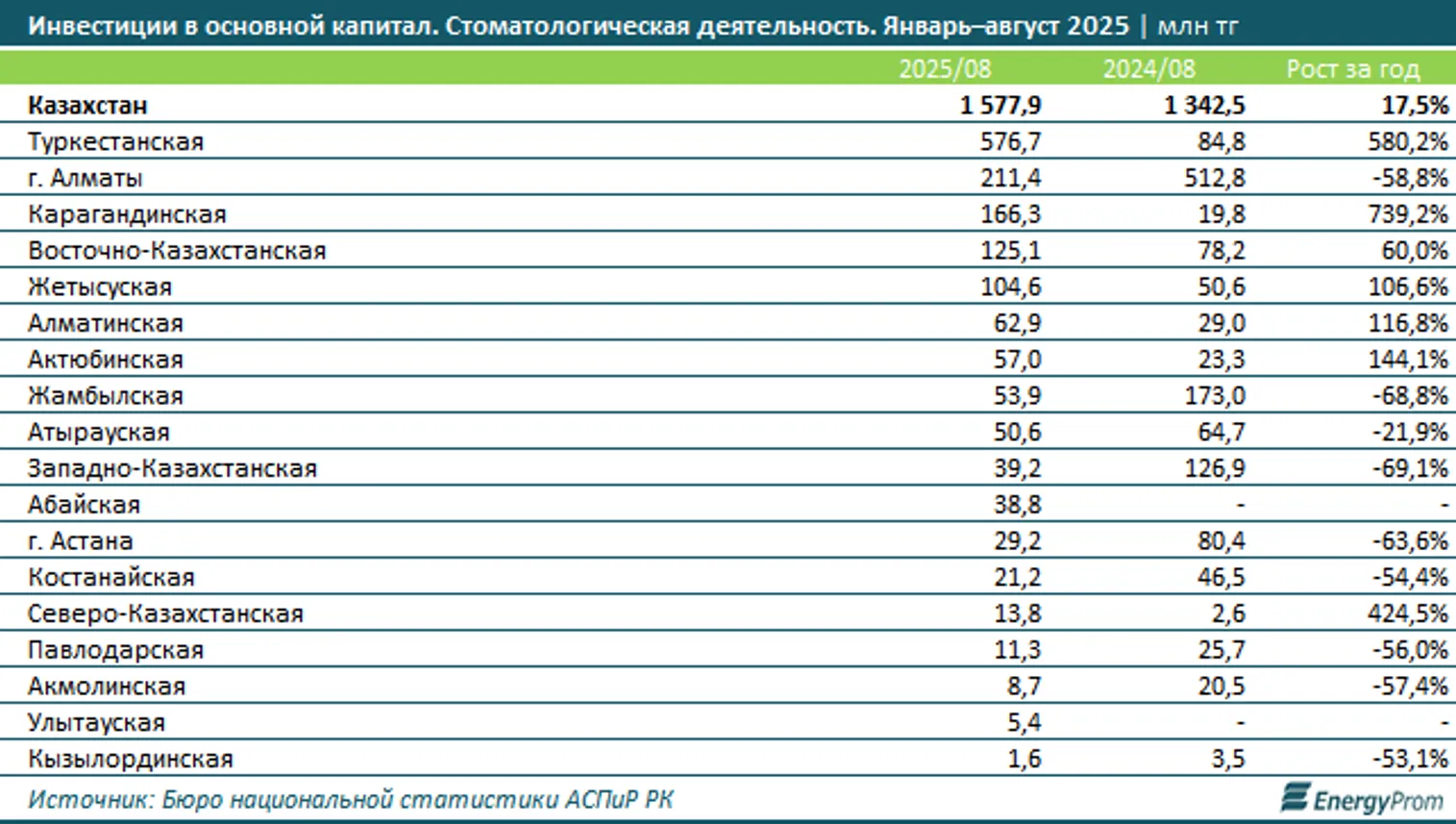 Инвестиции в основной капитал в сфере стоматологической деятельности за январь–август текущего года составили 1,6 млрд тенге — на 17,5% больше в стоимостном выражении, чем за аналогичный период 2024-го.