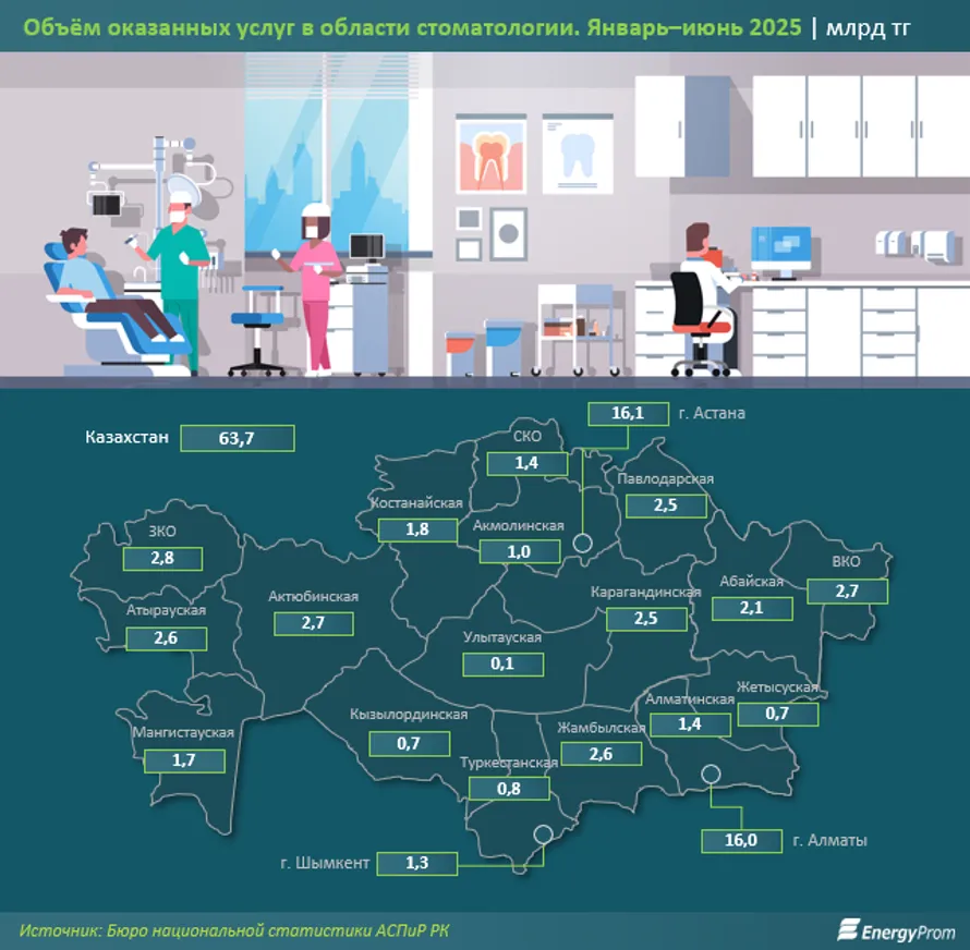 Наименьшие объёмы стоматологических услуг пришлись на Улытаускую (100,6 млн тенге), Кызылординскую (680,3 млн тенге) и Жетысускую (684 млн тенге) области.