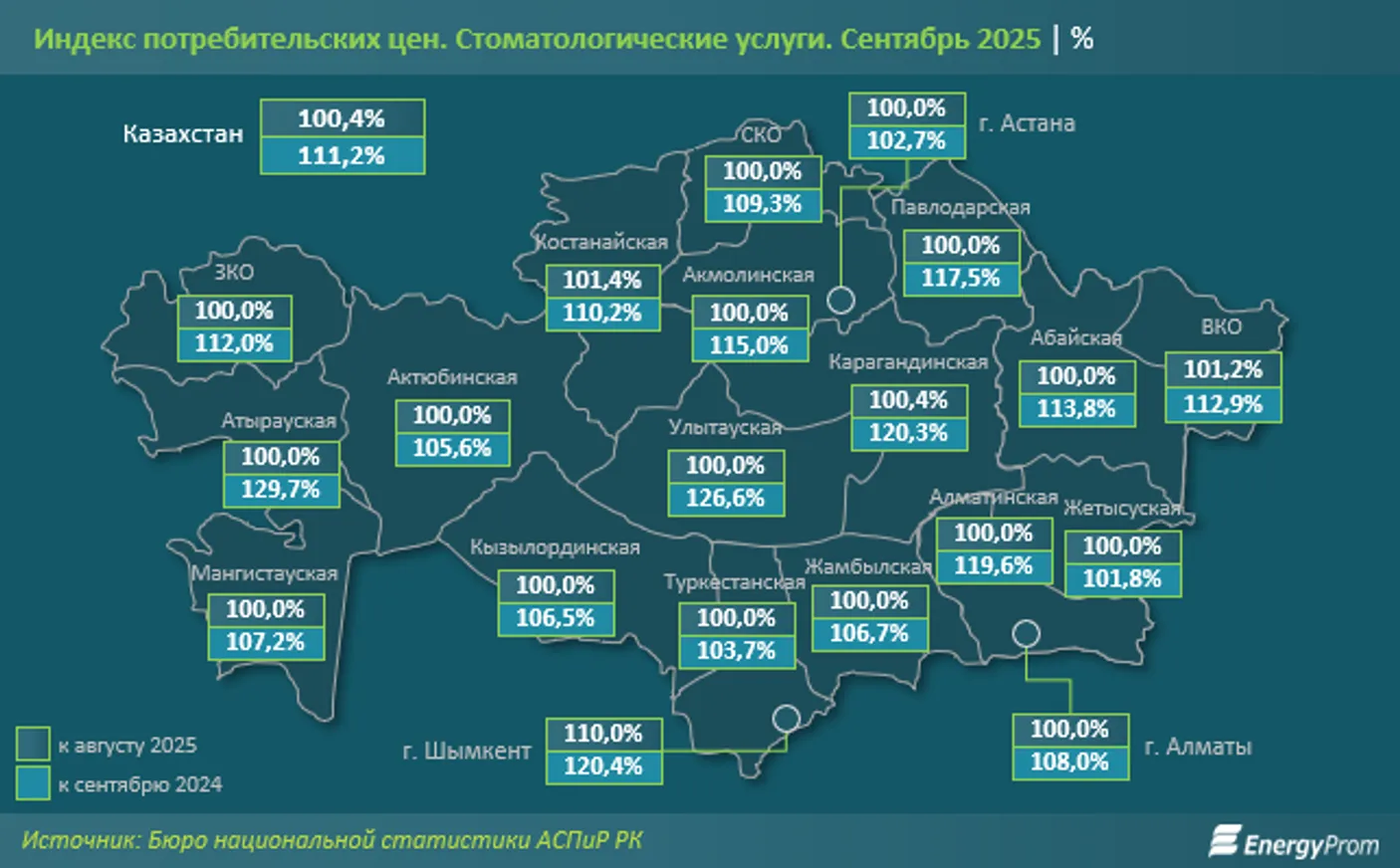 В годовой динамике удорожание стоматологических услуг было зафиксировано во всех регионах страны. Наибольший рост цен был отмечен в Атырауской (на 29,7%) и Улытауской (на 26,6%) областях, а также в Шымкенте (на 20,4%), наименьший — в Жетысуской области (на 1,8%), Астане (на 2,7%) и Туркестанской области (на 3,7%).