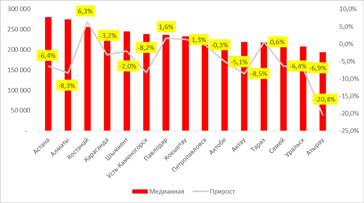 В то же время в ряде регионов зафиксировано снижение: Караганда (–3,2%), Шымкент (–2,0%), Семей (–6,4%), Усть-Каменогорск (–8,2%), Актау (–8,5%) и Уральск (–6,9%) показали умеренное падение медианных значений. Наиболее заметное снижение отмечено в Атырау — 193 819 тенге, что на 20,4% ниже уровня прошлого года.