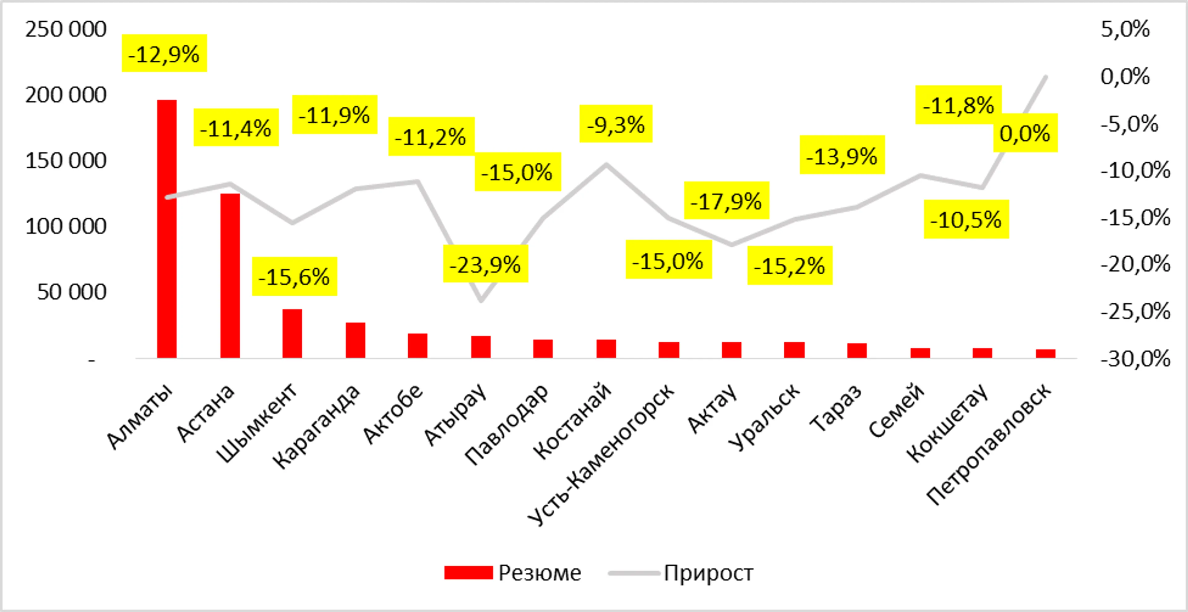 Среди других городов доля размещенных резюме остается сравнительно стабильной: Караганда (4,7%), Актобе (3,3%), Павлодар и Костанай (по 2,5%) демонстрируют умеренное снижение в пределах 9–15%. Более заметное сокращение числа резюме зафиксировано в Атырау (–23,9%) и Актау (–17,9%), тогда как в Петропавловске динамика осталась неизменной (0,0%).