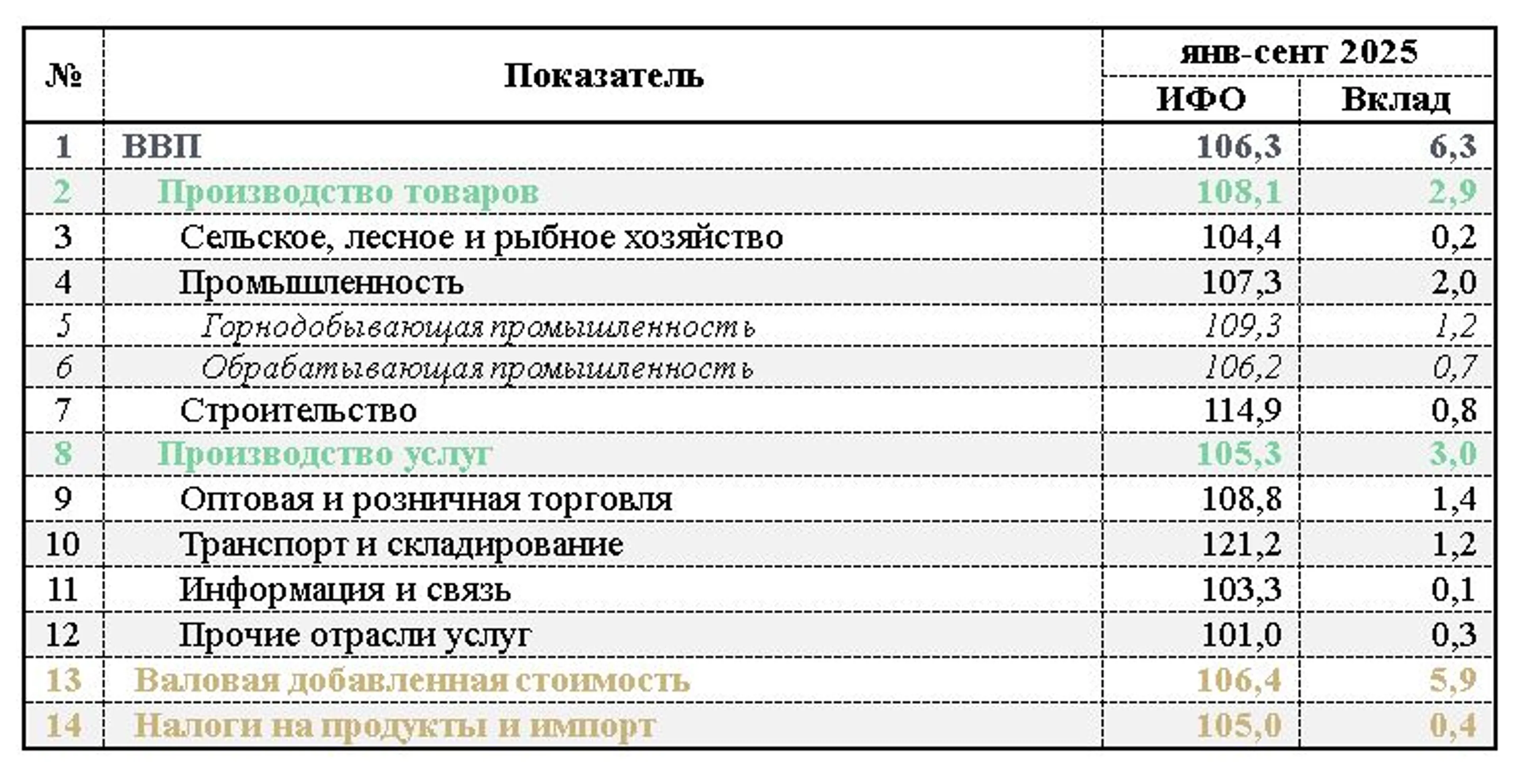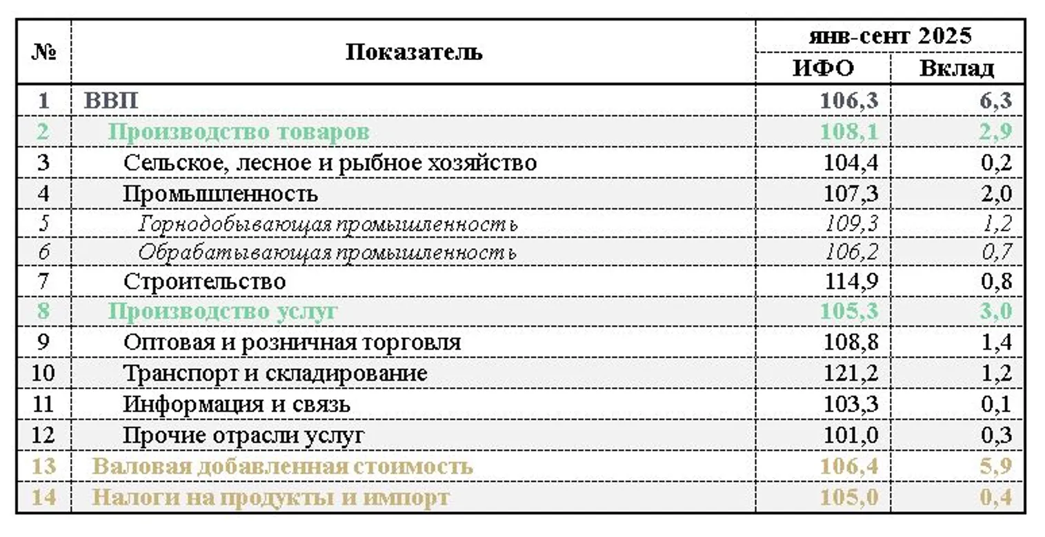 Основной вклад в рост экономики сделали прежде всего сфера услуг (3,0 п.п.) и блок производства товаров (2,9 п.п.) при поддержке чистых налогов (0,4 п.п.). В структуре вкладов это означает около 47,6% за счёт услуг и около 46,8% за счёт товаров, тогда как за восемь месяцев доля товаров была выше (49,2%) при меньшей доле услуг (44,4%). То есть добавилась «сервисная» компонента, при этом профиль роста по товарам остался сильным.