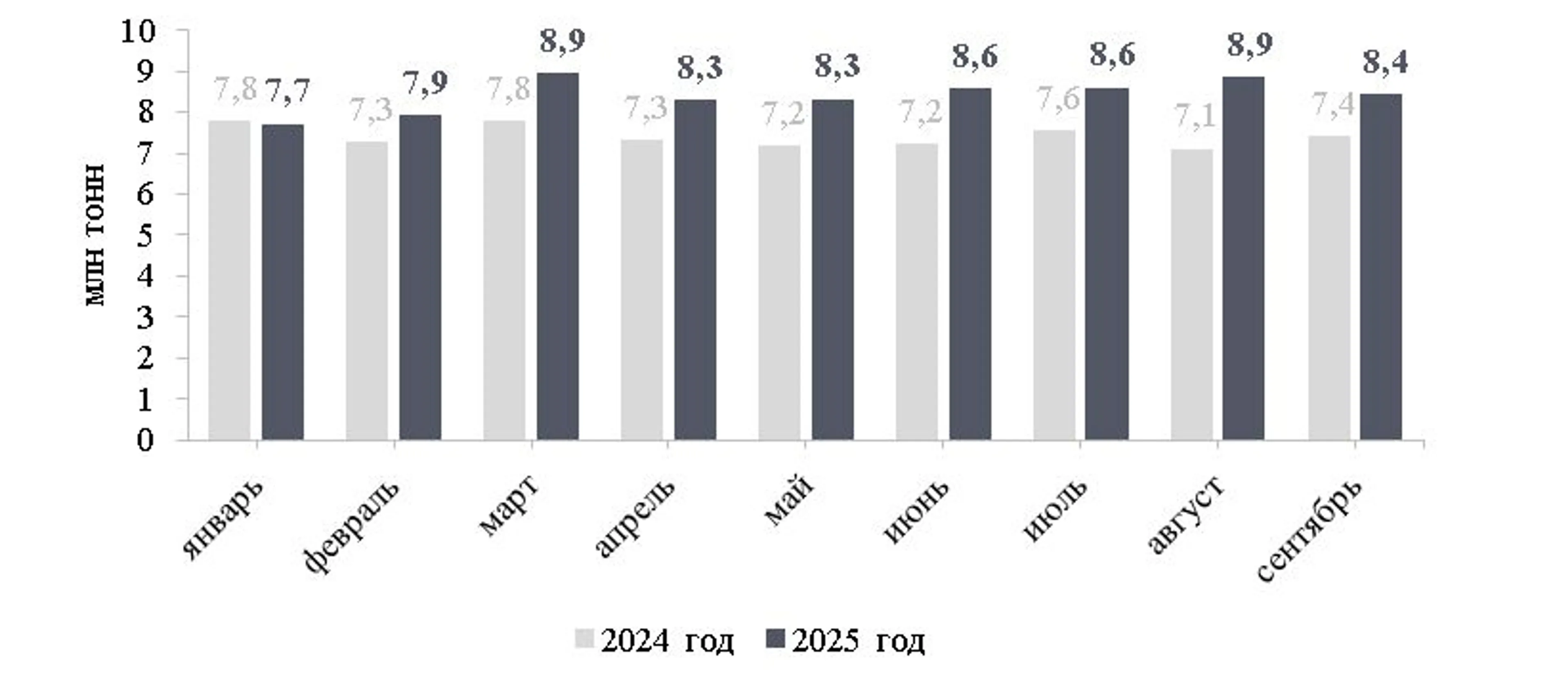Горнодобывающая промышленность и разработка карьеров (ИФО 9,3%, вклад 1,2 п.п.). Динамику определили наращивание добычи нефти на крупных месторождениях и высокая загрузка экспортной логистики. По итогам девяти месяцев 2025 года было добыто уже 75,7 млн тонн нефти, что больше объема соответствующего периода прошлого года на 9,0 млн тонн или на 13,4%. Поддерживающими факторами выступили благоприятная внешняя неценовая конъюнктура и стабильная работа магистральной инфраструктуры, что обеспечило отрасли крупнейший вклад среди «товарных» сегментов экономики.