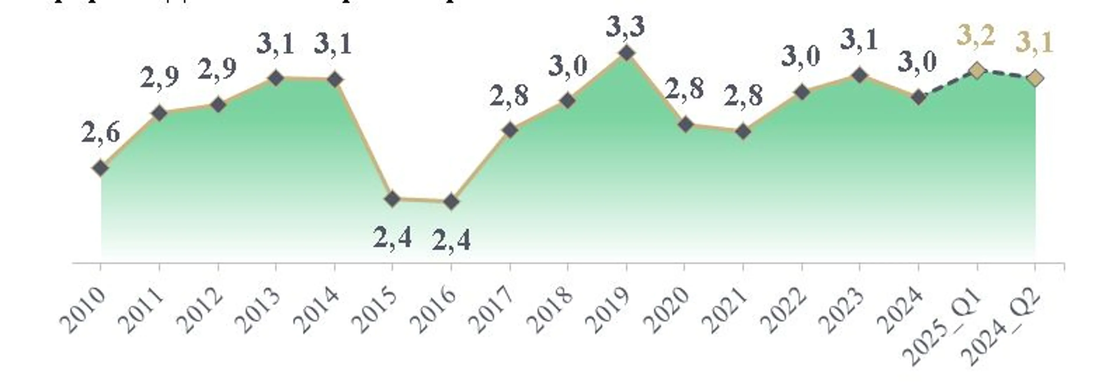 По предварительным данным правительства за девять месяцев 2025 года, экономика Республики Казахстан в реальном выражении выросла на 6,3% по сравнению с 4,1% аналогичного периода прошлого года.