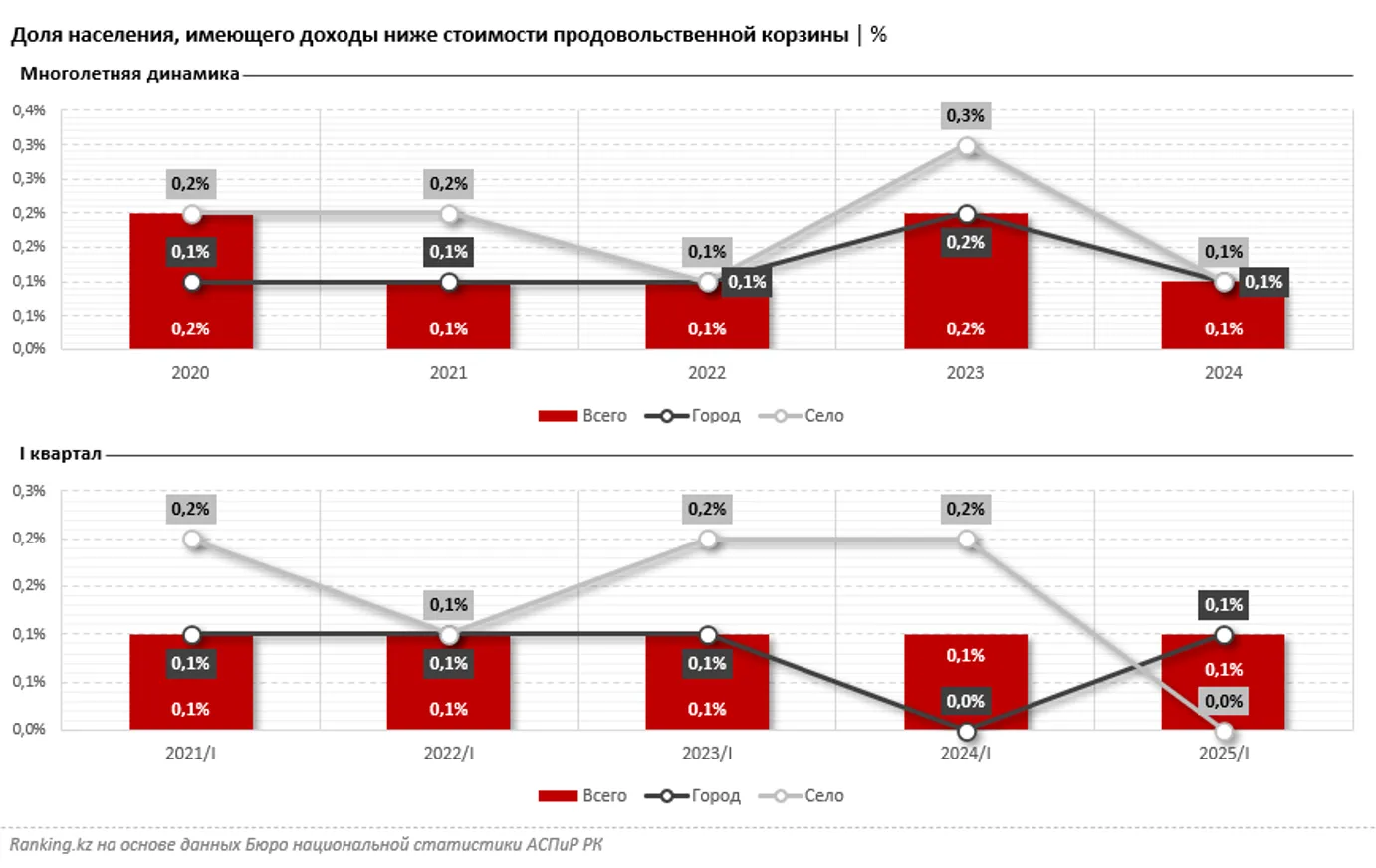 Рассмотрим внутреннюю казахстанскую статистику. По данным Бюро национальной статистики АСПиР РК, доля населения, имеющего доходы ниже стоимости продовольственной корзины, в прошлом году составила 0,1%, против 0,2% в 2023 году. При этом в 2024 году и в городской местности, и на селе показатели оказались одинаковыми, в то время как в 2023-м удельный вес населения, имеющего доходы ниже стоимости продовольственной корзины, составлял 0,2% в городской и 0,3% в сельской местности.