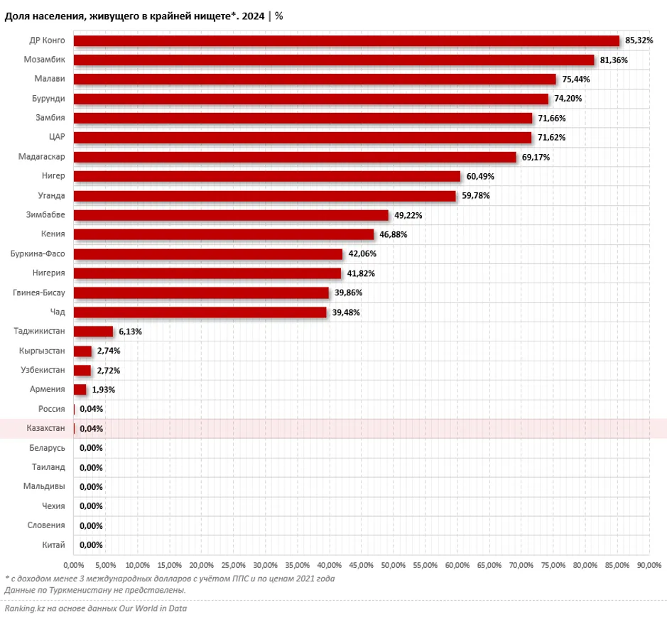 Невеселый факт: сразу 24 из 30 стран с самым высоким уровнем крайней бедности находились в Африке. Наивысший уровень бедности наблюдался в Демократической Республике Конго: 85,32% населения там жили менее чем на 3 международных доллара в день. Следом расположились Мозамбик (81,36%), Бурунди (74,2%), Замбия (71,66%) и ЦАР (71,62%). В список стран, где более половины населения находятся в крайней нищете, также вошли Мадагаскар (69,17%), Нигер (60,49%) и Уганда (59,78%).