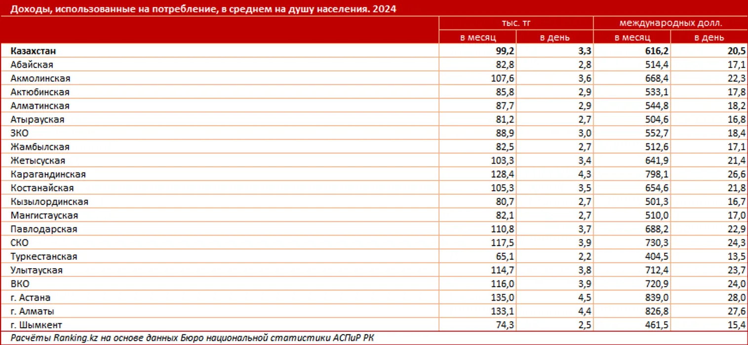 Между тем доходы, использованные на потребление, в 2024 году составили 99,2 тыс. тенге в среднем на душу населения в месяц, или 3,3 тыс. тенге в день (7 долларов по среднему курсу за прошлый год). При этом в пересчете на международные доллары, использующиеся для определения уровня крайней бедности, казахстанцы в среднем в день тратили на потребление сумму, эквивалентную 20,5 международного доллара. Согласно данным Всемирного банка, международный доллар стоил 160,93 тенге, то есть на эту сумму в Казахстане можно было купить тот же набор товаров и услуг, который в США обошелся бы в 1 доллар.
