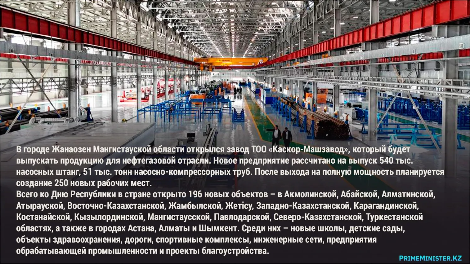 Ко Дню Республики по всей стране вводятся в эксплуатацию 196 новых объектов – от крупных промышленных предприятий до социальных, спортивных и инфраструктурных проектов. Все они реализованы в рамках исполнения поручений главы государства Касым-Жомарта Токаева, направленных на повышение качества жизни населения и развитие регионов, сообщает Primeminister.kz.
