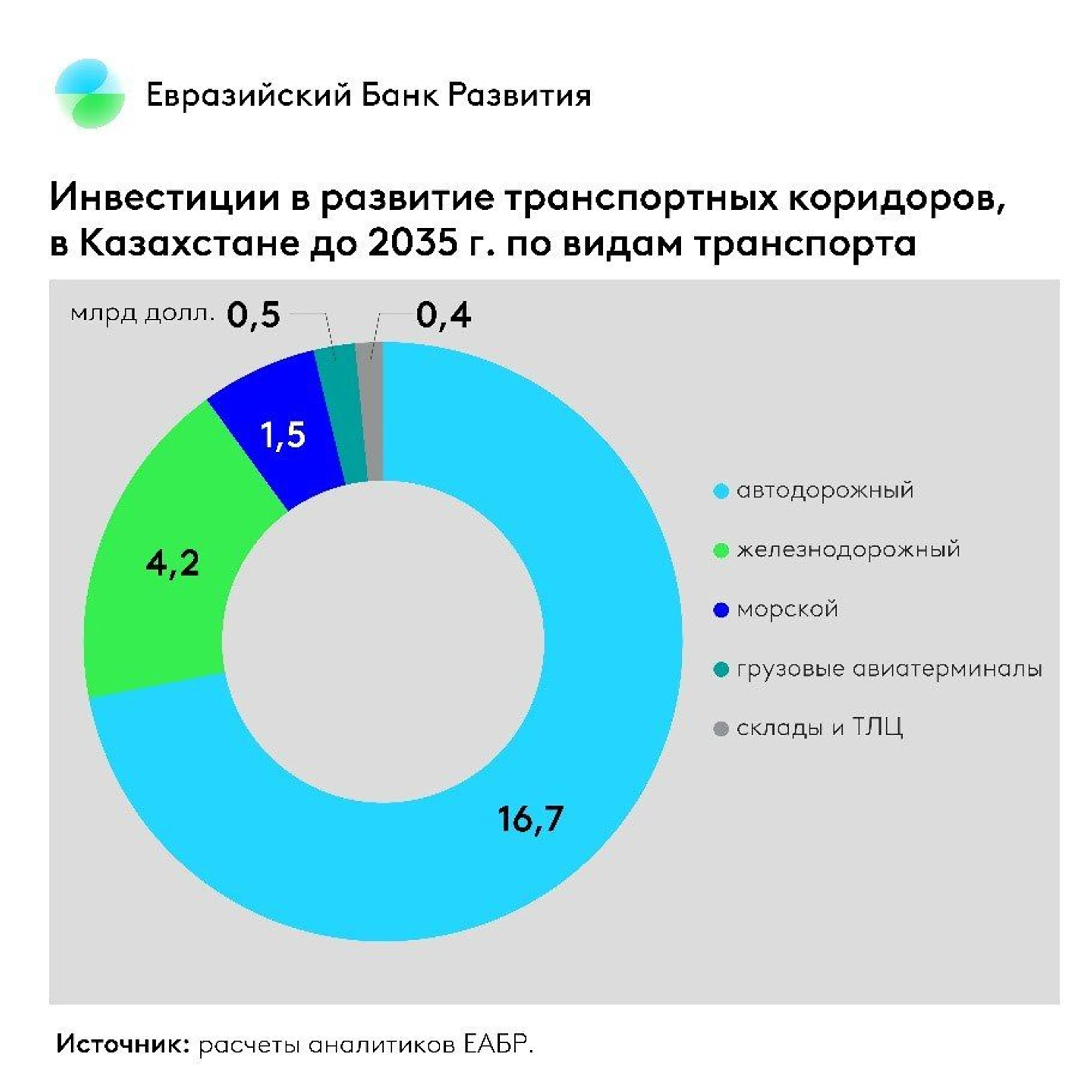 По объему инвестиций в развитие Евразийского транспортного каркаса Казахстан занимает 2-е место среди 13 государств Евразийского региона (10% от общего объема инвестиций) и 1-е место в Центральной Азии (44%). Такие данные приводятся в докладе ЕАБР «Евразийский транспортный каркас: обсерватория проектов и интерактивная карта», сообщает корреспондент центра деловой информации Kapital.kz со ссылкой на пресс-службу банка.