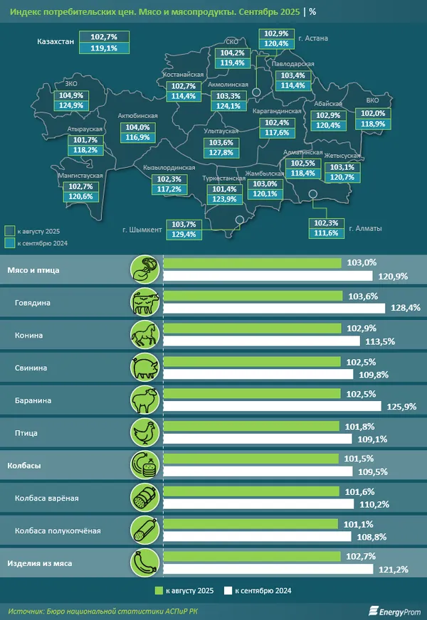 В региональном разрезе в сентябре месячный рост цен на мясо и мясопродукты наблюдался во всех регионах РК. Наибольшее удорожание было отмечено в Западно-Казахстанской (на 4,9%), Северо-Казахстанской (на 4,2%) и Актюбинской (на 4,0%) областях, наименьшее — в Туркестанской области (на 1,4%).