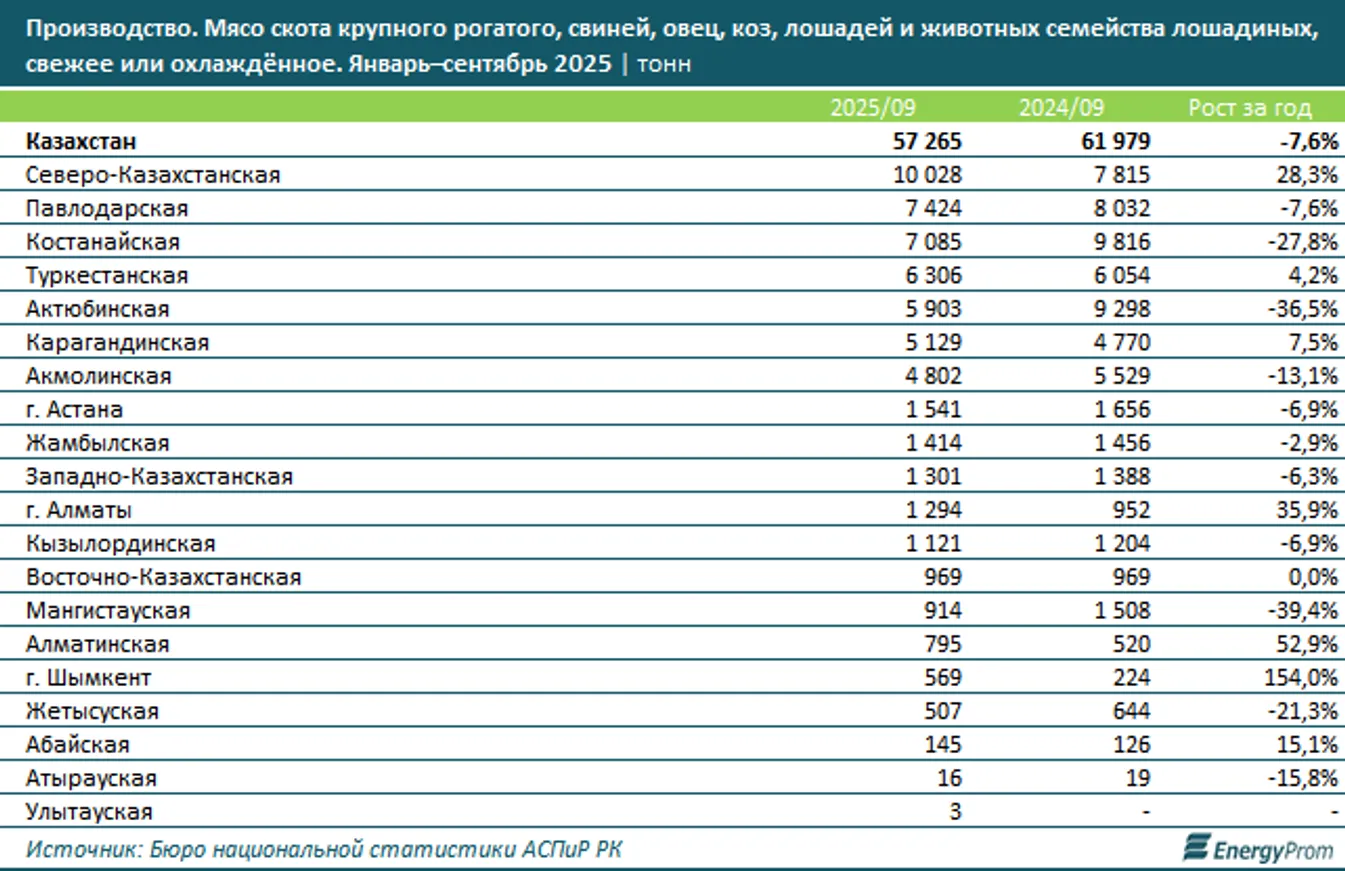 За январь–сентябрь 2025 года в РК было произведено 57,3 тыс. тонн свежего или охлаждённого мяса крупного рогатого скота, свиней, овец, коз, лошадей и животных семейства лошадиных — на 7,6% меньше, чем за аналогичный период 2024-го, пишет energyprom.kz.