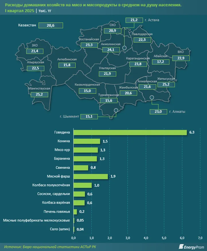 Меньше всего мяса и мясопродуктов во втором квартале 2025-го потребили жители Кызылординской области: 15 кг на человека, против 16,2 кг годом ранее. Весьма скромные показатели также были отмечены в Шымкенте и Туркестанской области: 15,1 и 15,6 кг соответственно.