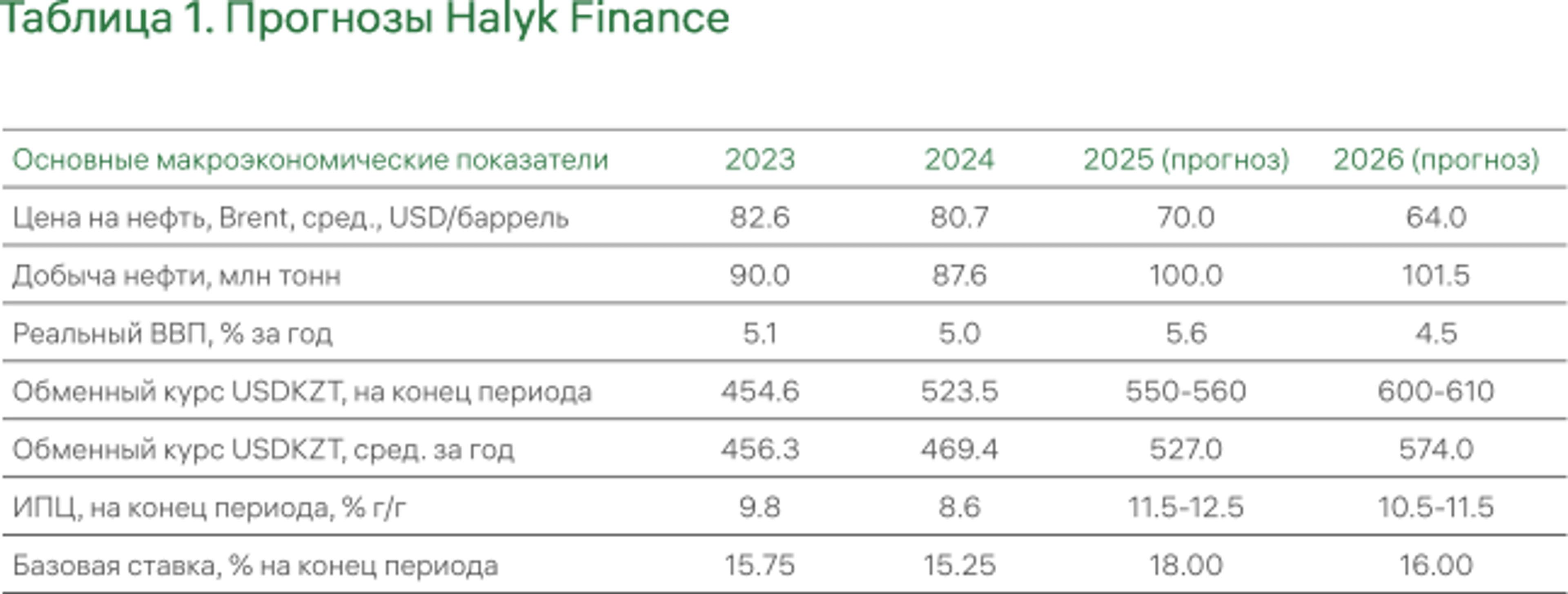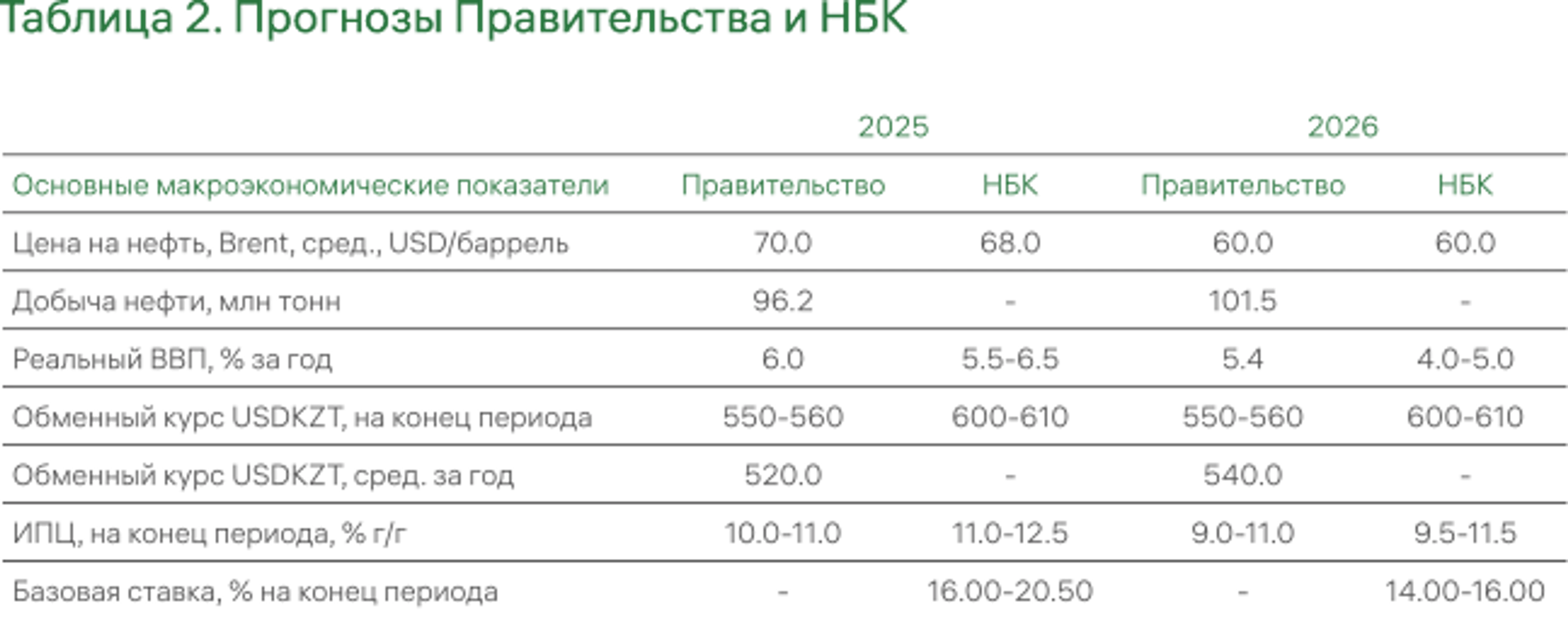 В 2026 году темпы роста экономики, по нашим оценкам, снизятся до 4,5%, что связано с ожидаемым падением цен на нефть, замедлением роста нефтедобычи, сокращением трансфертов из Национального фонда, ростом налоговых ставок, снижением темпов роста потребкредитования, высокой инфляцией, слабой динамикой роста доходов населения и завершением ряда крупных государственных инфраструктурных проектов. В целом экономика РК вступает в фазу охлаждения после периода активного роста, стимулированного бюджетными расходами и расширением нефтедобычи.