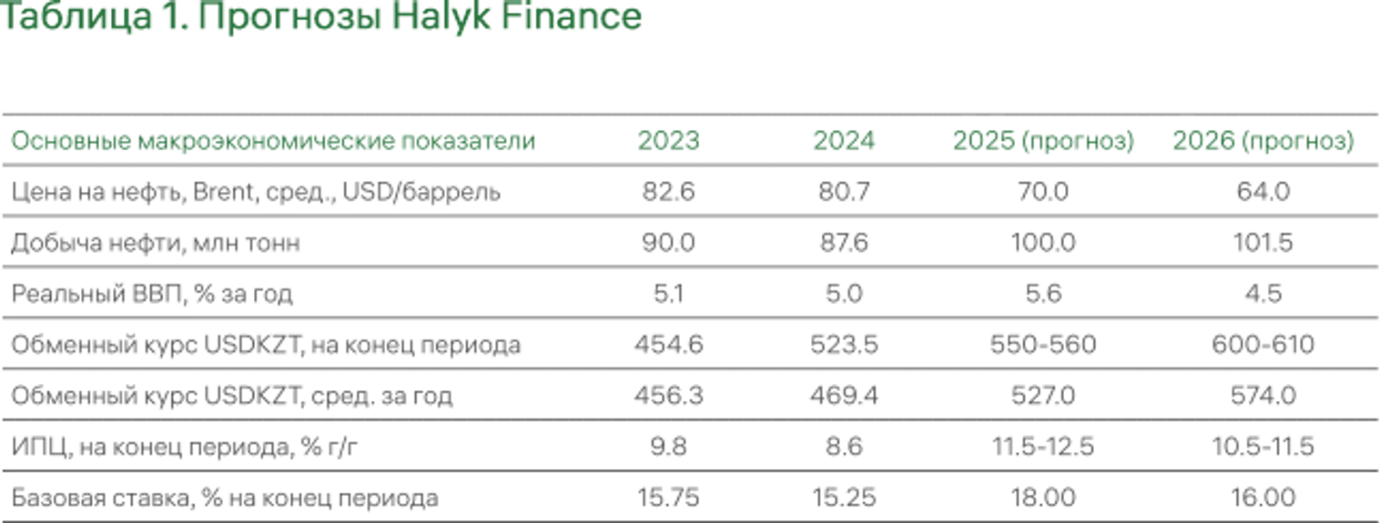 По нашим прогнозам, курс тенге к концу 2025 года ослабнет до 550-560 тенге за доллар, а к концу 2026 года – до 600-610 тенге за доллар на фоне внешнеэкономических рисков и внутренних факторов.