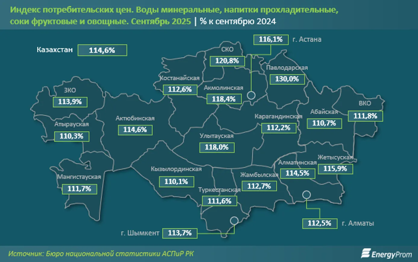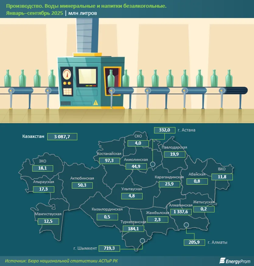За январь–сентябрь текущего года в Казахстане произвели 3,1 млрд литров минеральной воды и безалкогольных напитков — сразу на заметные 23,9% больше, чем за аналогичный период 2024 года, сообщает Energyprom.kz.