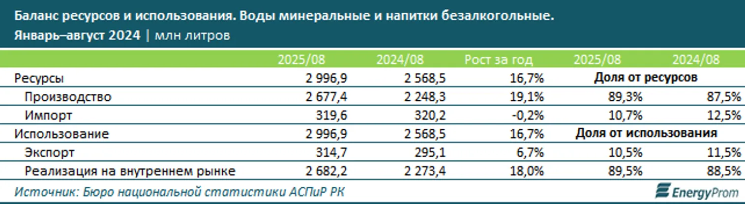 Реализация на внутреннем рынке достигла 2,7 млрд литров — на 18% больше, чем за январь–август прошлого года.