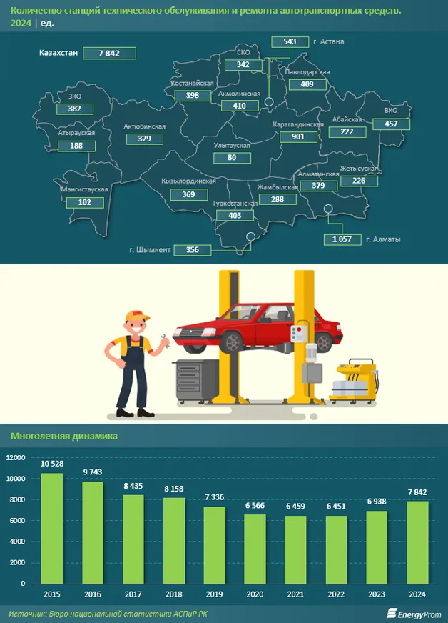 Количество станций технического обслуживания и ремонта автотранспортных средств растёт второй год подряд. В 2024-м в РК насчитывалось 7,8 тыс. таких станций. При этом стоит отметить: ещё 10 лет назад их количество превышало 10,5 тыс., а к 2022 году сократилось до 6,5 тыс.
